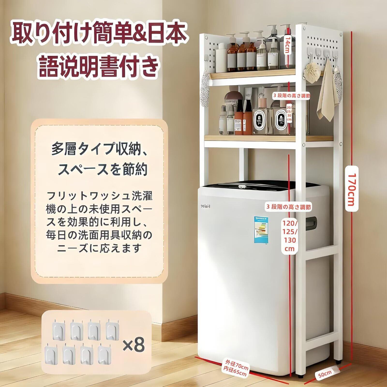 洗濯機ラック ランドリーラック 2段 70*50*170.5cm 乾燥機 スタンド 高さ調節可能 有孔ボード付き 洗濯機上収納 頑丈 ぐらつき防止 省スペース 組立簡単 ベランダ お風呂 ランドリー用 日本語説明書付き(白い)