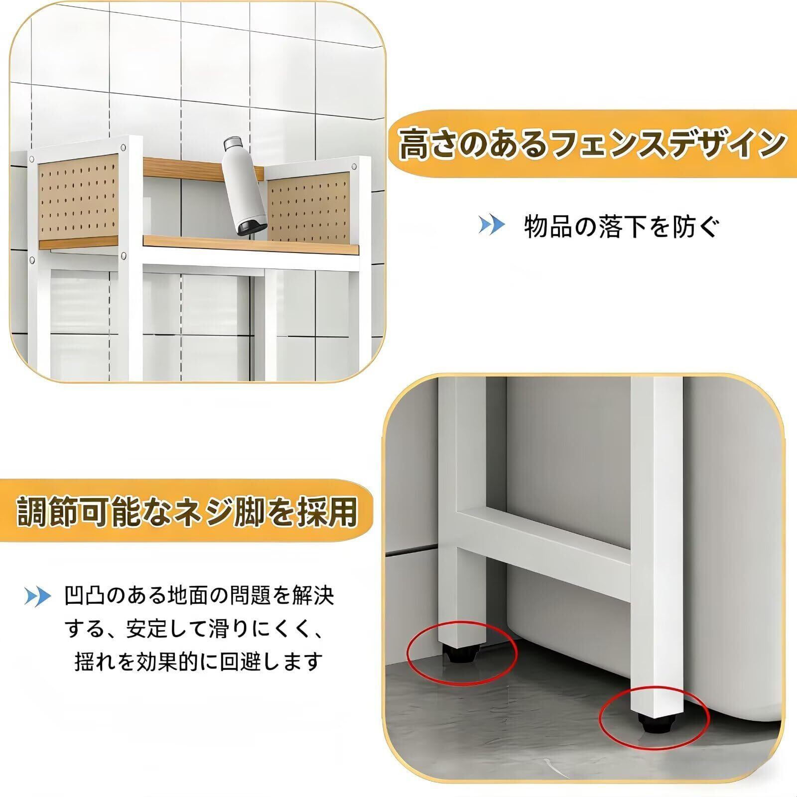 【高い耐荷重】この洗濯機ラックは耐荷重が100kgと強力で、重い洗濯用品でも、その他の日用雑貨でも、簡単に運ぶことができ、家族の毎日の収納ニーズに応えます。調節可能なネジ脚を採用、凹凸のある地面の問題を解決する、安定して滑りにくく、揺れを効果的に回避します。