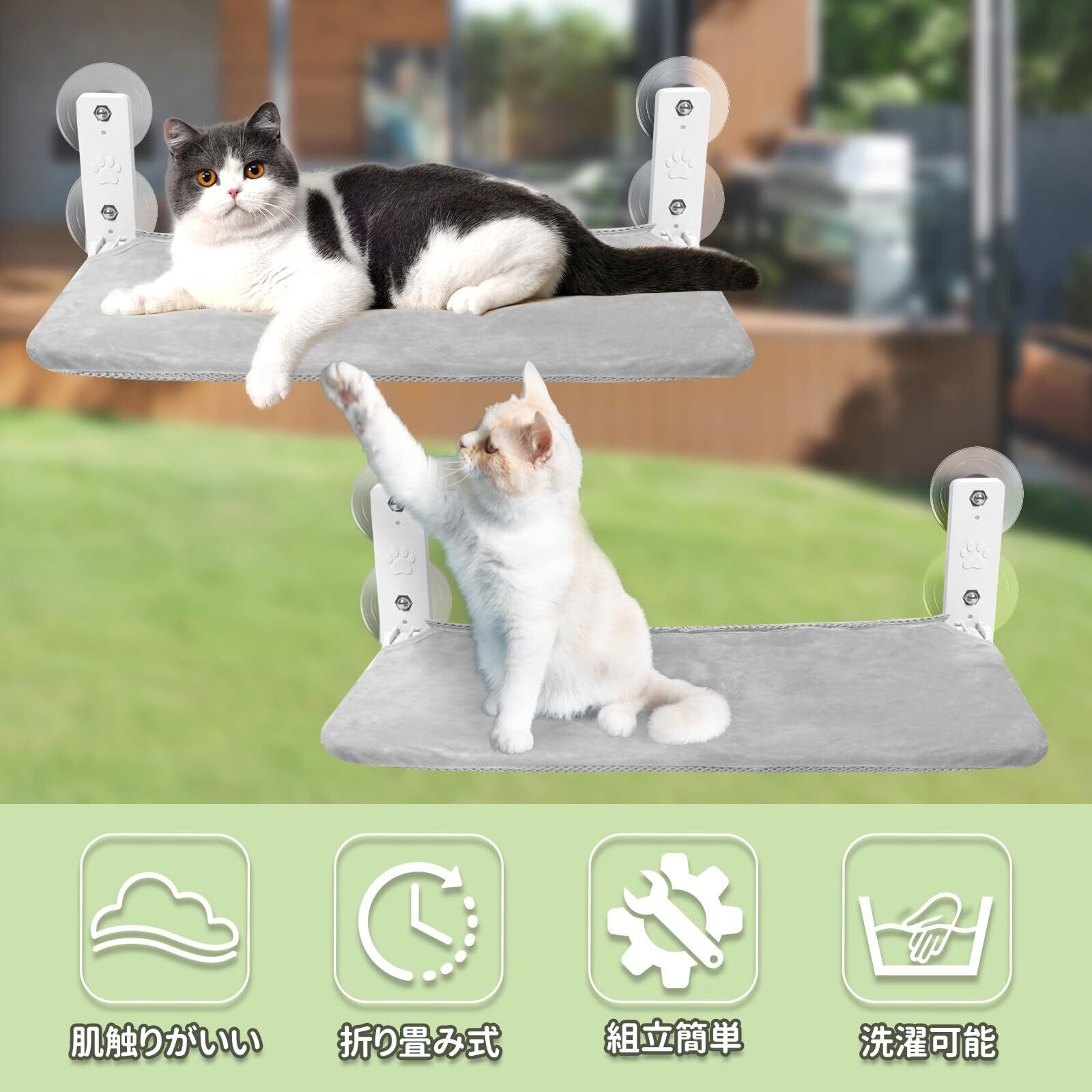 【2倍の吸盤で吸引力UP】直径8.3cmの大型吸盤4つで作動。従来上下分けの吊りタイプより受け力を2倍up!ニャンコが強く飛び乗りでも大丈夫。万が一一つ緩めても吊りタイプと違い、落下する恐れがありません。
