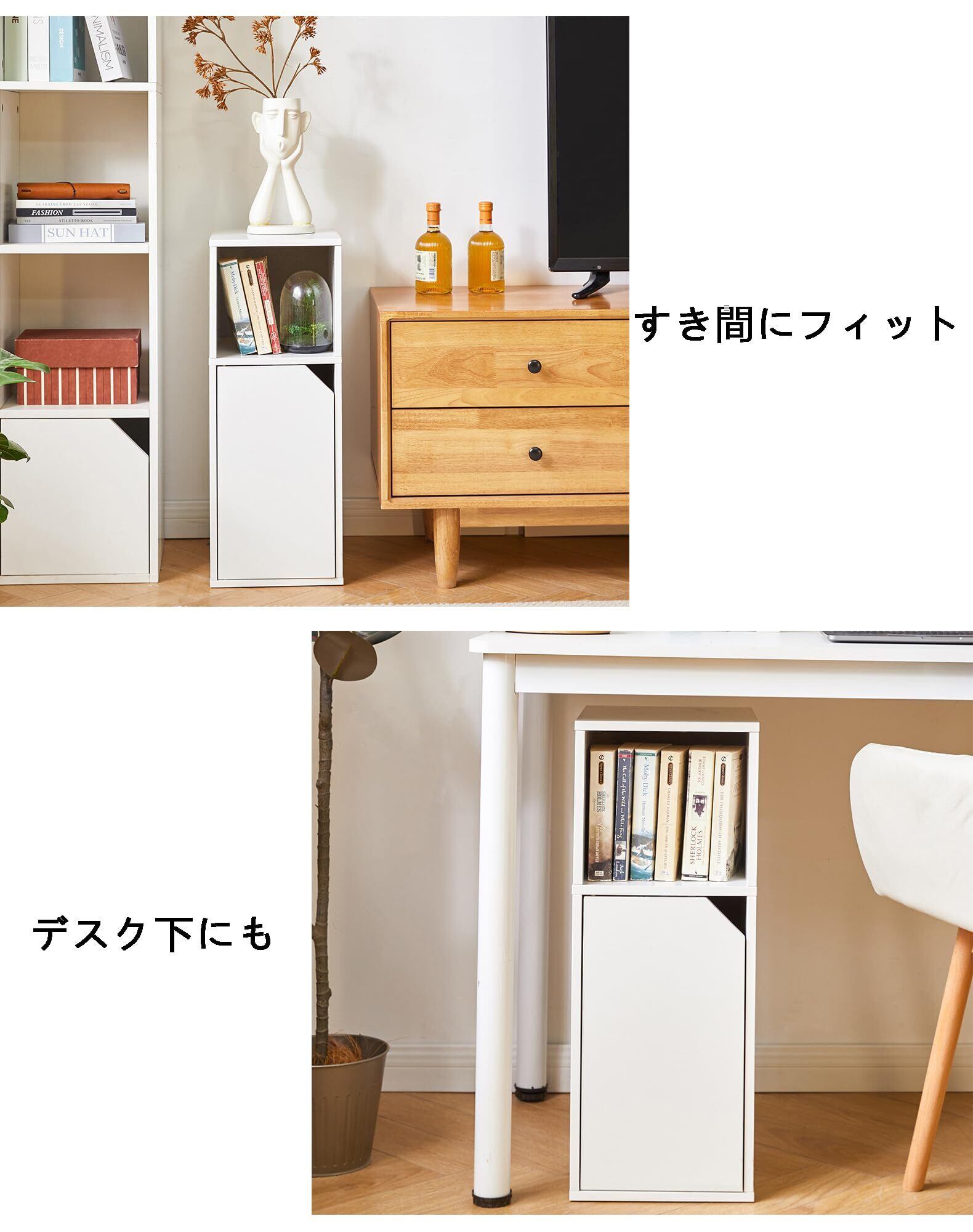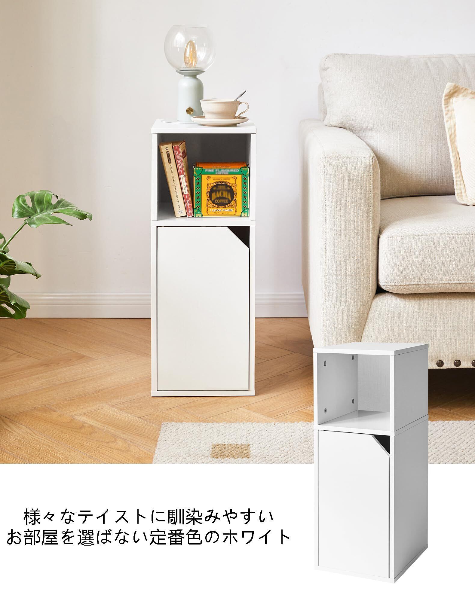 魅せると隠すの両立:上段はラフに文庫文・ティッシュ箱が入れられるオープンな収納スペース。下段は可動棚で、収納したい物に合わせて三段階調節でき、高さのある置物も置けます。さらに扉付きで、生活感を抑えたスッキリ見た目のサイドテーブルとしてお使いいただけます。