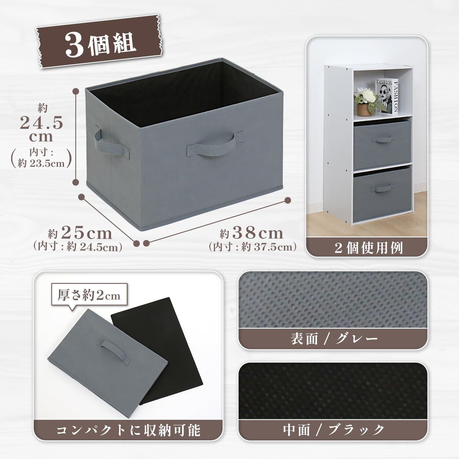 【商品仕様】:外寸/約幅38×奥行25×高さ24.5cm(内寸/約幅37.5×奥行24.5×高さ23.5cm)、カラー/グレー×ブラック、材質/ポリプロピレン・紙、内容/3個セット