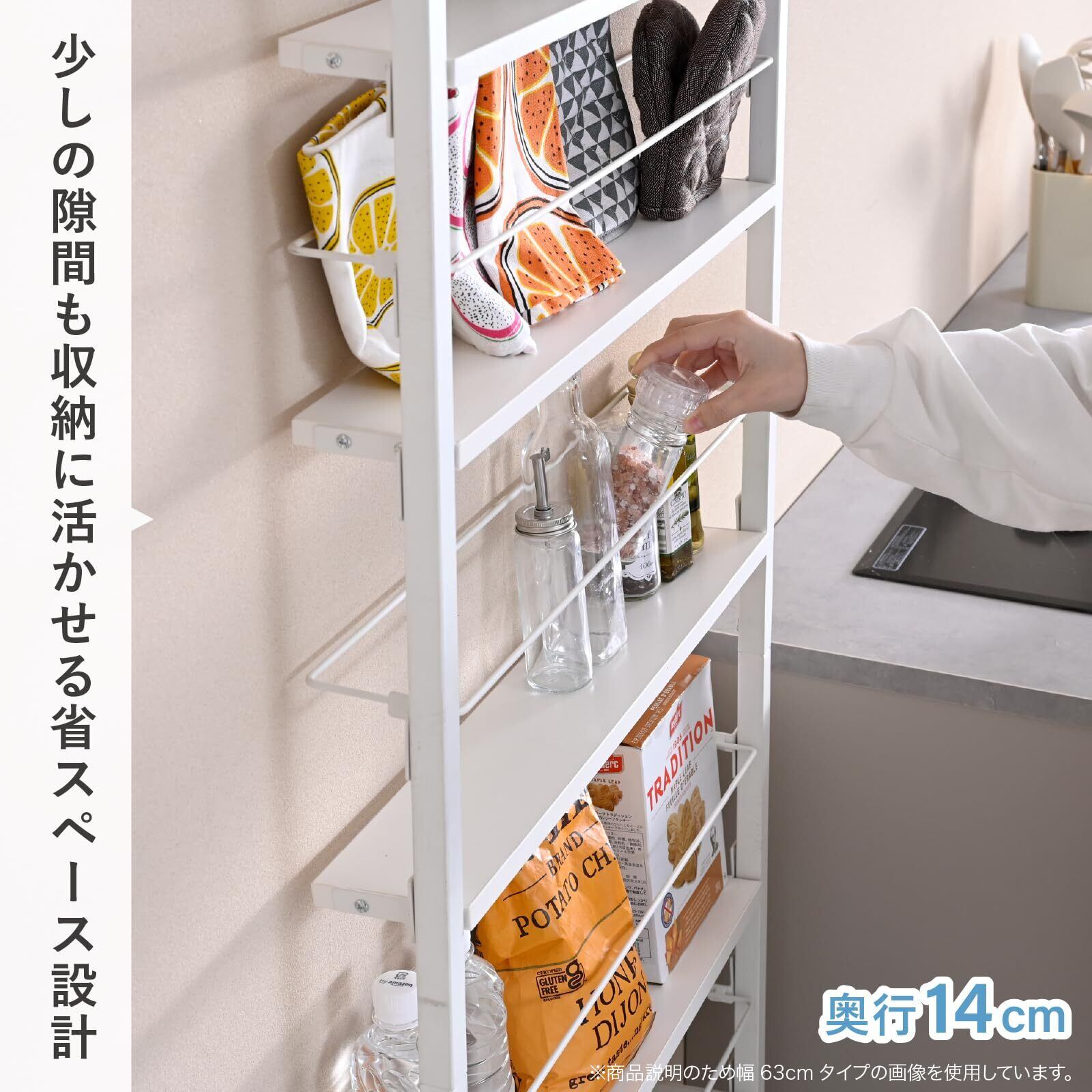 【狭いすき間を有効活用】奥行14cmのとってもスリムでちょっとした隙間を収納へと活用できる突っ張りラックです。突っ張り式なので天井近くのデッドスペースまで収納として使えます。