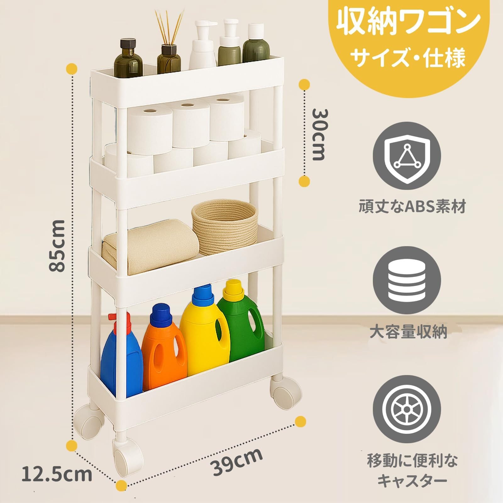 キッチンワゴン スリム キャスター付き 収納ワゴン キッチンラック 4段 隙間収納 幅39×奥行12.5×高さ85cm ワゴン 調味料棚 キッチン 洗面所 収納 4枚ホック付き カンタン組立 ホワイト