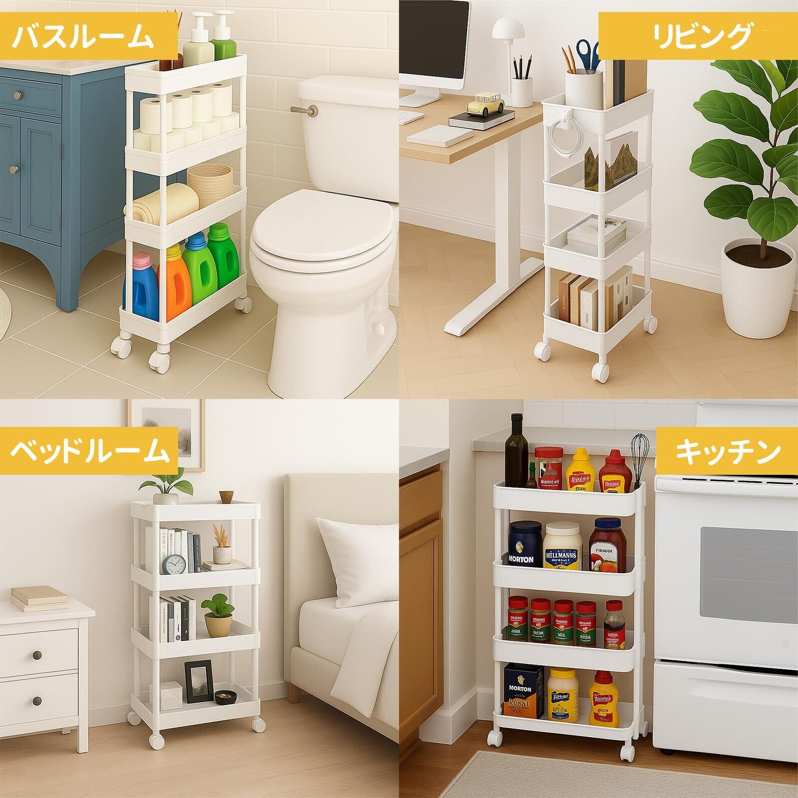 スリム設計で部屋の隙間を活用でき、スペースを節約し充分利用します。調味料、洗剤、バスルーム用品を楽に収納可能です。キッチン、コンロ横、洗面所、美容室などの隙間に適用。洗面台と壁の間、冷蔵庫横、玄関などでの使用に最適です。狭い人や空間を有効利用したい人はぜひお試してください。