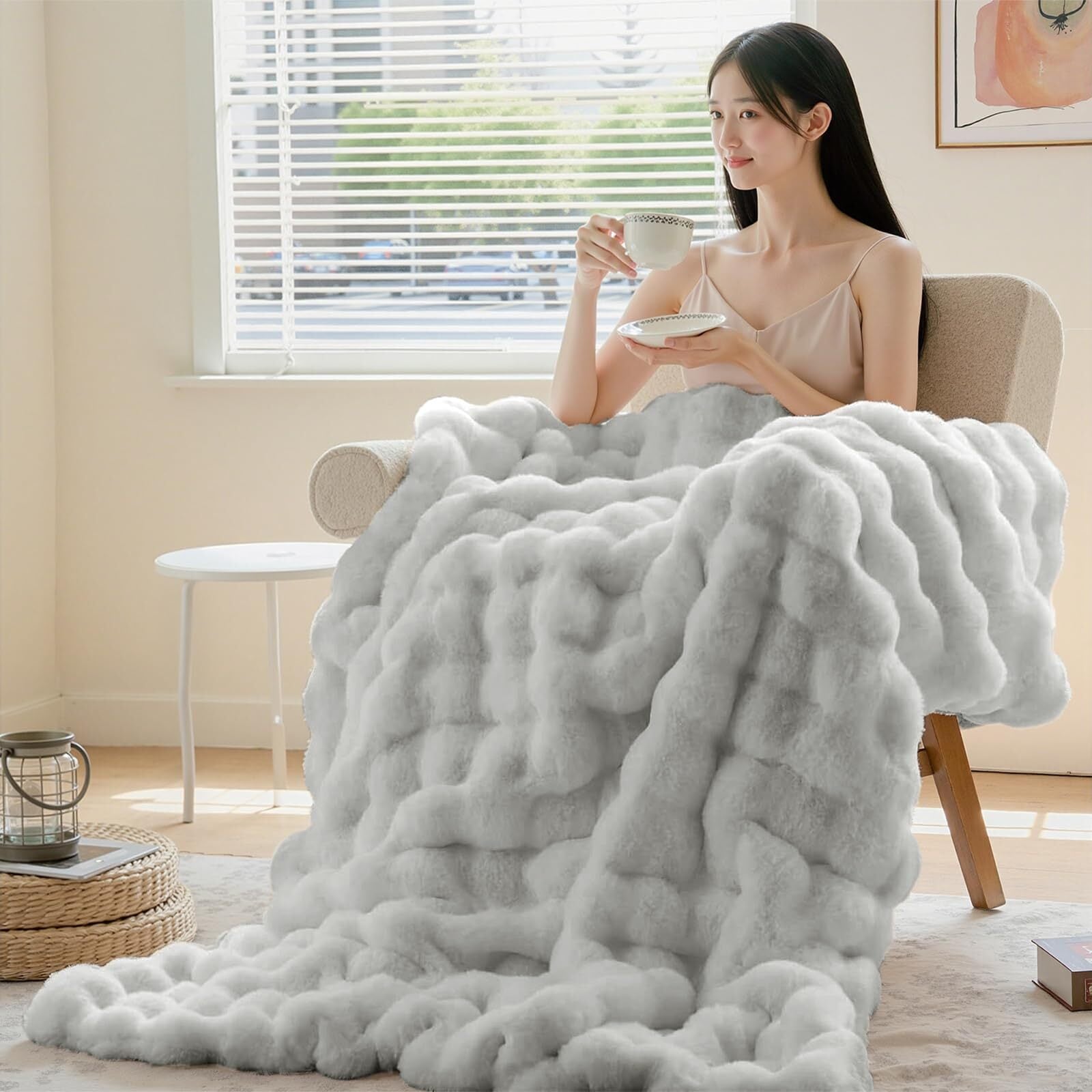 【毛布仕様】上層:ラビット調ファー 下層:ミンクファー調ファー サイズ:130*160cm カラー:グレー 重さ:2.15kg 洗濯機で洗えるブランケット仕様。