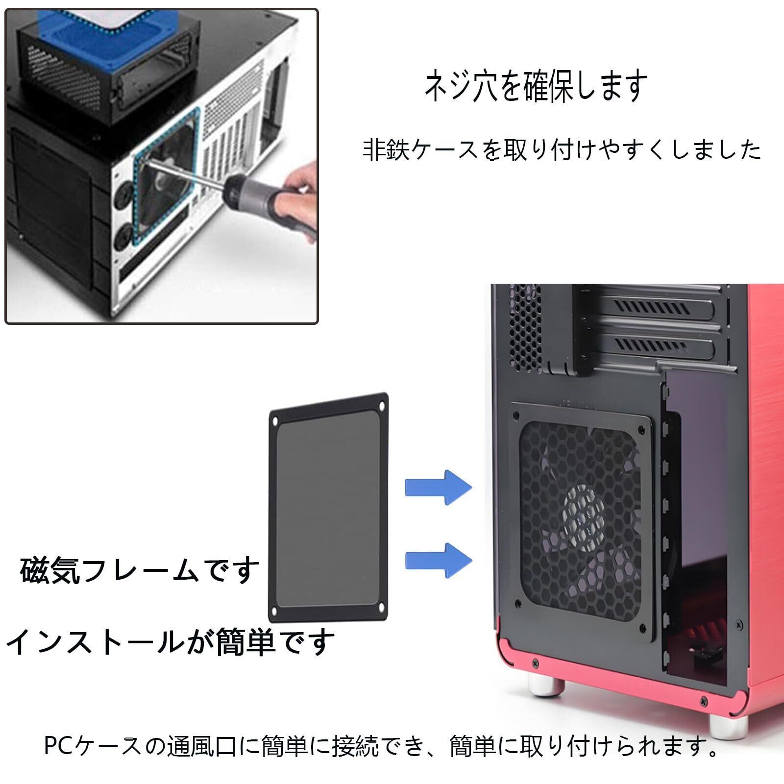 磁気フレーム設計により、ケースまたは電源の清潔さと放熱性の向上がされます。このフィルターはシャーシや電源の通気孔に簡単に取り付けることができ、塵や埃の侵入を効果的に隔離できます