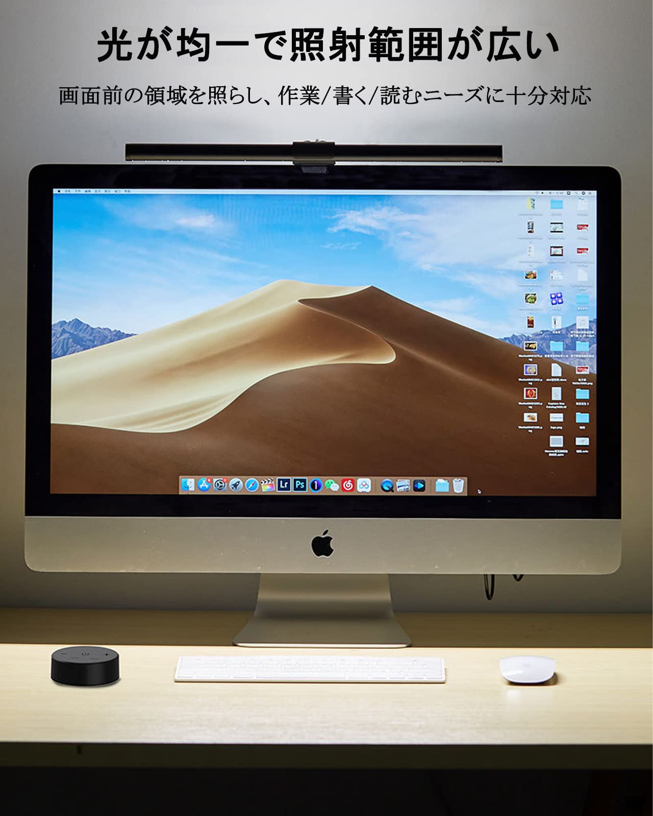 【3色温度無段階調光✚反射光制御】このモニターライトは黄色光、自然光と白色光の3種類色温度が切り替え、3100〜6400Kの色温度の範囲をカバーして、様々なシーンで活用できます。明るさは無段階調整でき、ニーズによって選ばれます。非対称光学設計により、スクリーンからの反射光を制御し、長時間PC作業で目にかかる負担を減らします。その上、 ライトの演色性は90Ra以上となっており、照らされる物の本来の色は変わらなく、リアルな色を示します。光源波動は安定です。