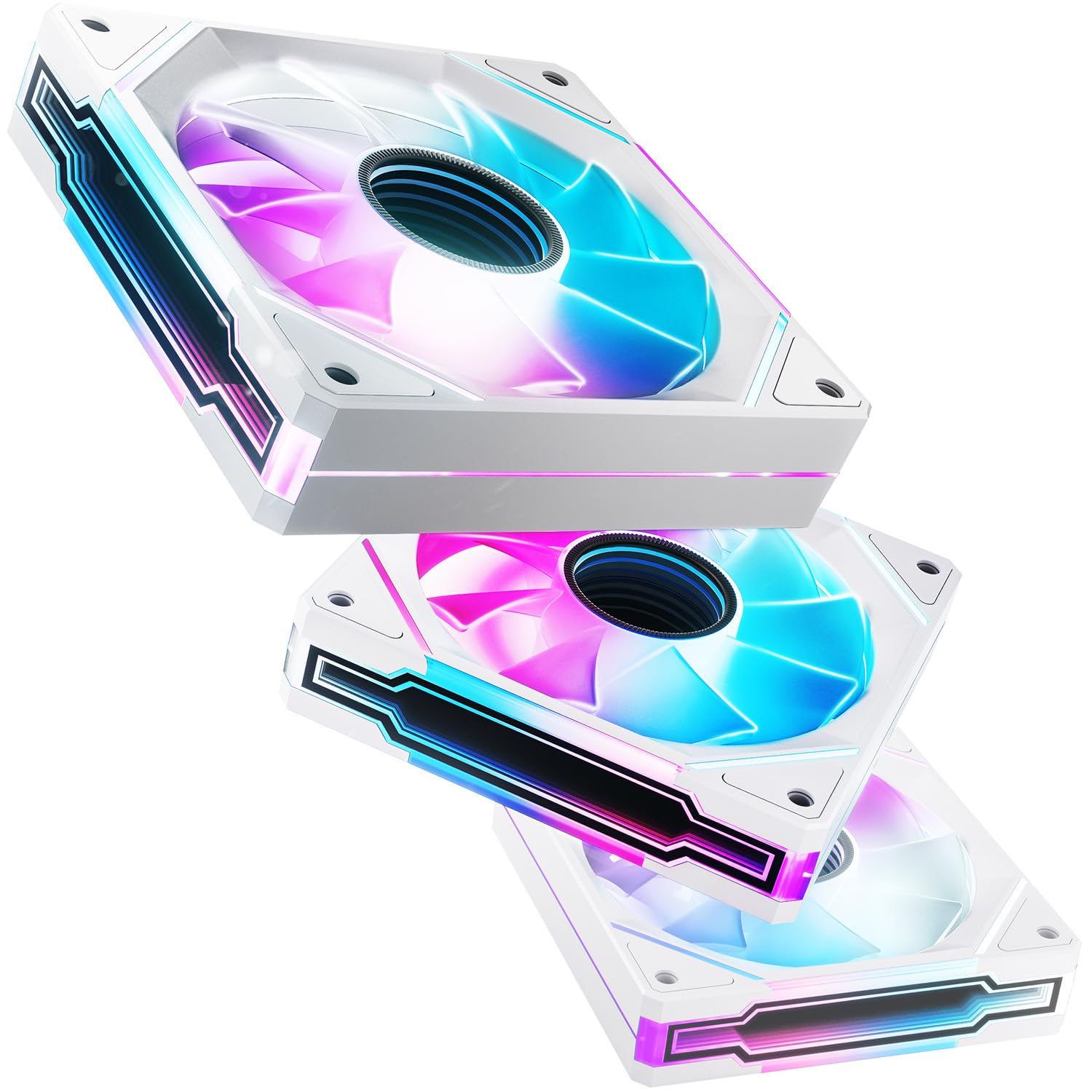 [仕様]: モデル:AMICI-5GT-White。数量:3本。サイズ:120*120*2.5。正向きファンブレード。回転数:650-1800 RPM/Min。ノイズ:6-30 dB(A)。風量:61.5 CFM 。風圧:2.0mmH2O。ベアリングのタイプ:ハイドロダイナミックベアリング。寿命:50000時間以上。240/360mmのCPU水冷高さに対応。