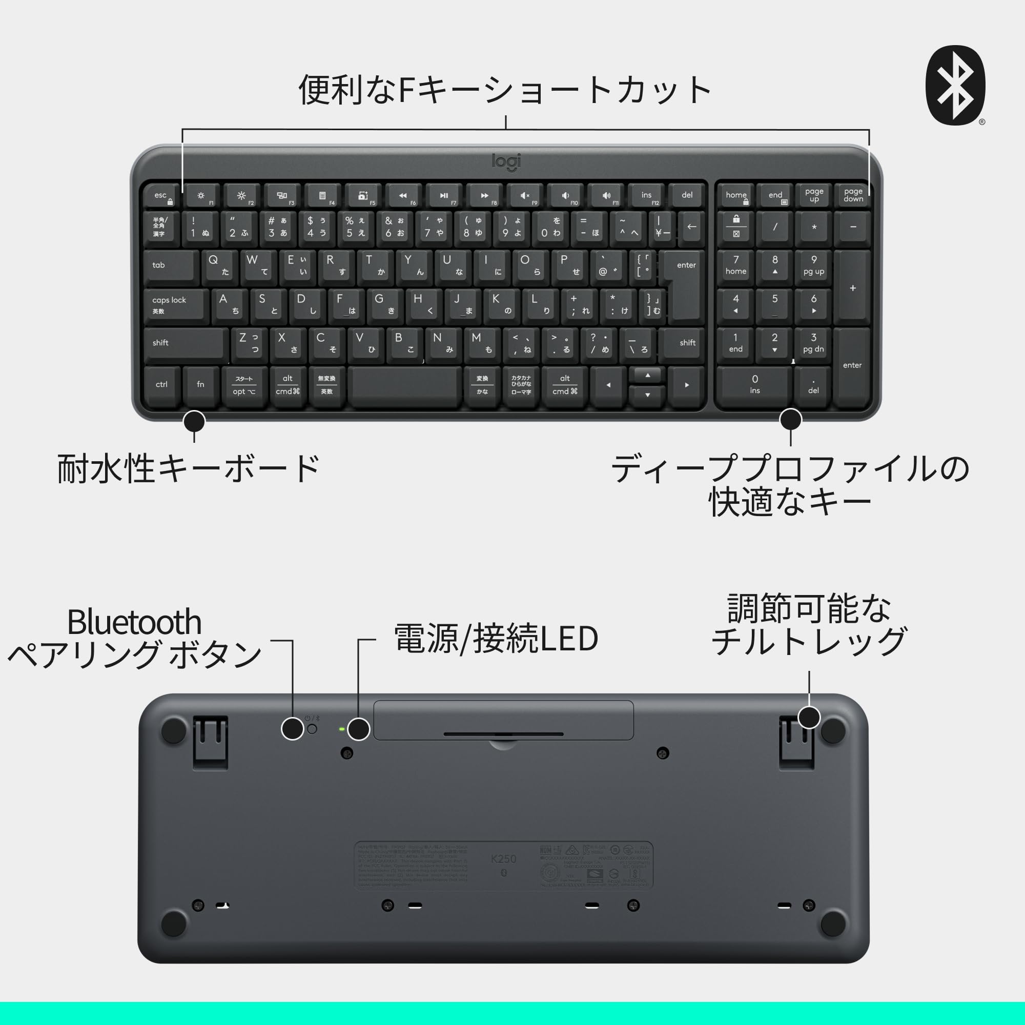 ロジクール MK250 キーボードは、Bluetooth接続が可能なテンキー搭載のコンパクトなキーボード K250とBluetooth接続のワイヤレスマウス M196のセットです。