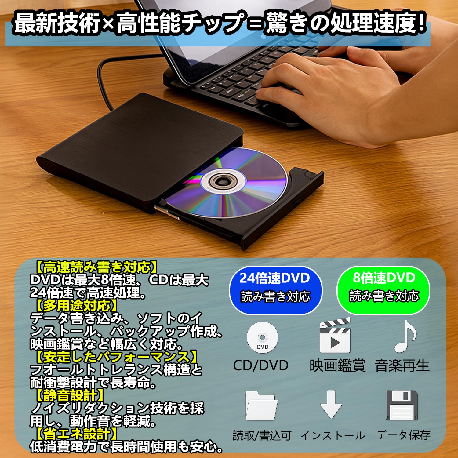 【最新なインテリジェント技術を採用】CD / DVD-rom、CD-R / RW、DVD±R / RWをサポートできます。最大8倍の DVD読み取り、8倍のDVD書き込み、24倍のCD読み取りと8倍のCD書き込みスピードを提供、 ファイルの書き込み、ソフトのインストール、ディスクバックアップの作成、DVDムービーの鑑賞などを対応できます。