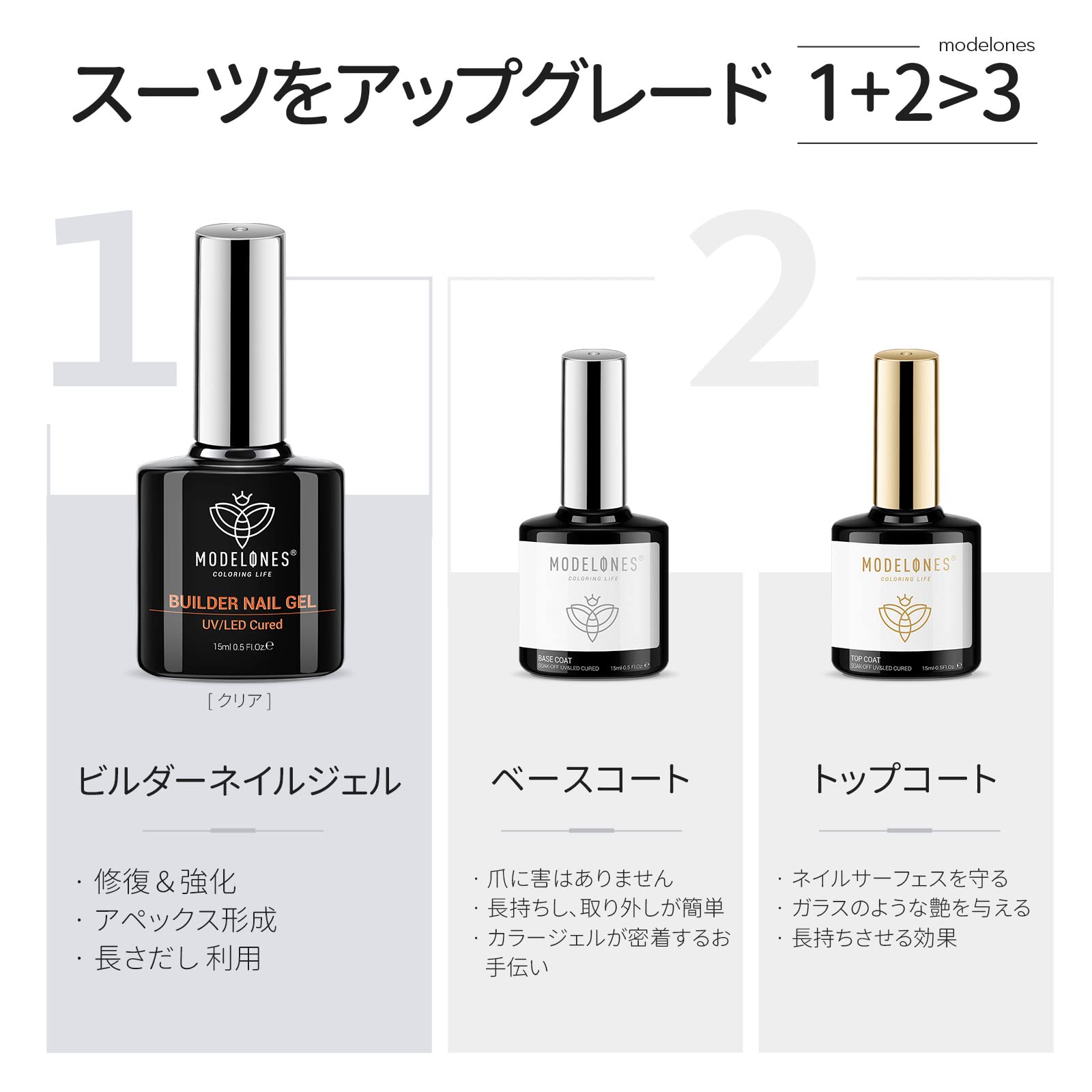 Modelones ジェルネイル トップ コート ベース コート ビルダー ネイル ジェル 3*15mlセット、ノンワイプトップコート、 トップ コート シャイン フィニッシュ、7-in-1 クリア ジェル ビルダー 爪の強化 アペックス ジェルネイル用 UV/LED対応 ネイルジェル カラージェルネイル、女性へのギフト