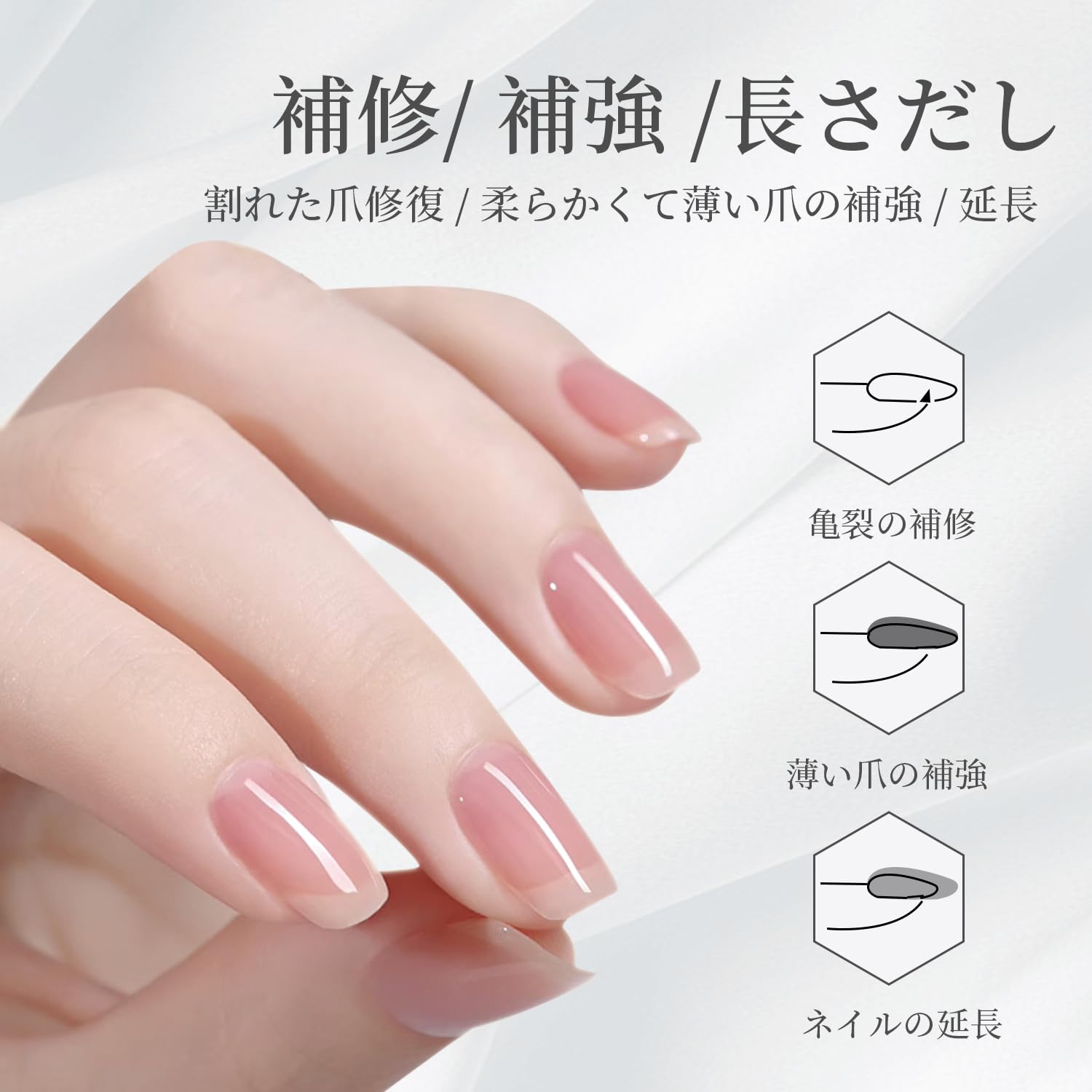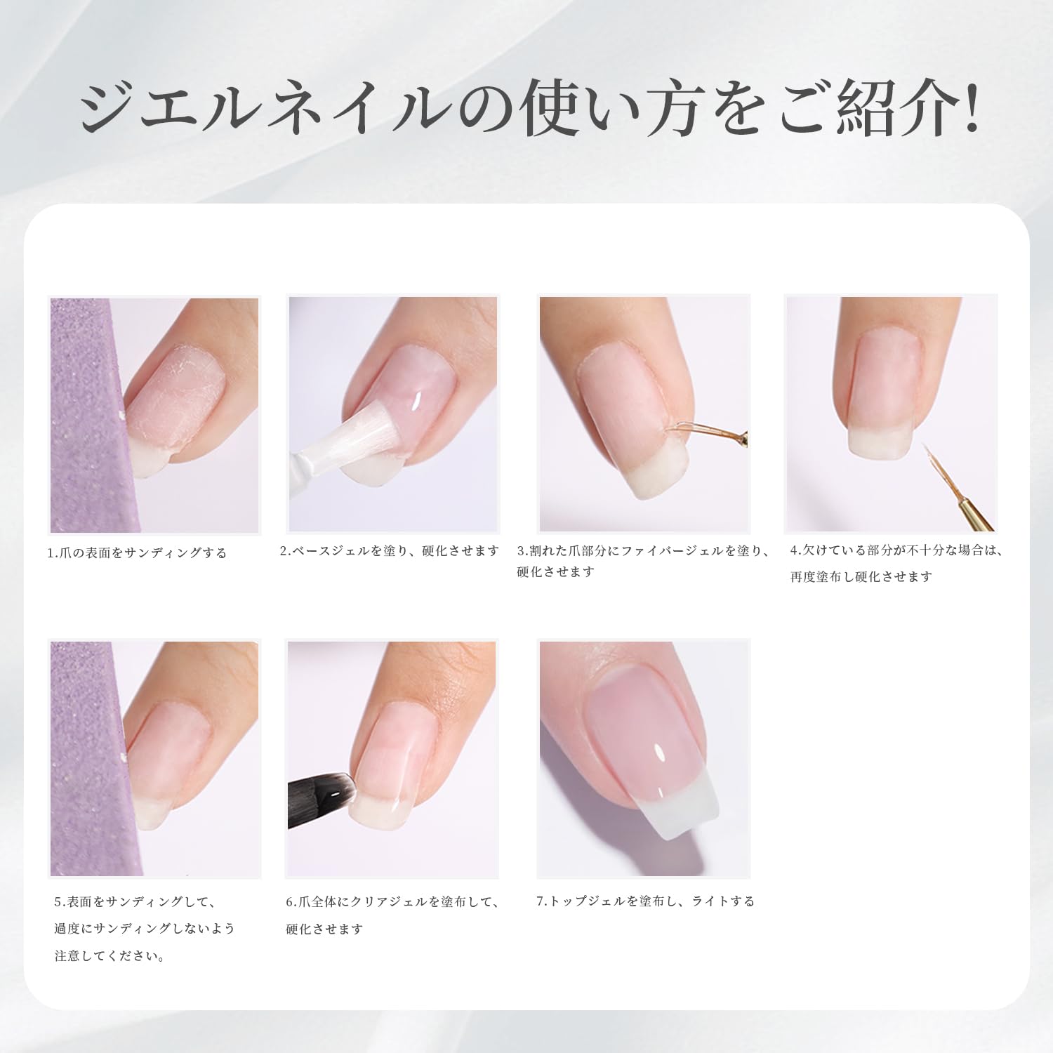 【割れた爪のリペア】割れた爪、自爪の亀裂等の補修に最適!柔らかい薄い爪の補強にも対応します。クリアの材質で、本物の鎧のように保護・強化・補修機能を発揮するクリアジェル。短爪に、少し長さ延長が可能に対応します。 【操作上のご注意点】亀裂の爪の硬度を補強する場合、ファイバー ベースジェルは用量を多めに取り、割れ爪にやや広く塗布してください。ライトした後に表面をサンディングしてください。過度にサンディングしないよう注意してください。これにより亀裂の爪に十分な強度が得られます。