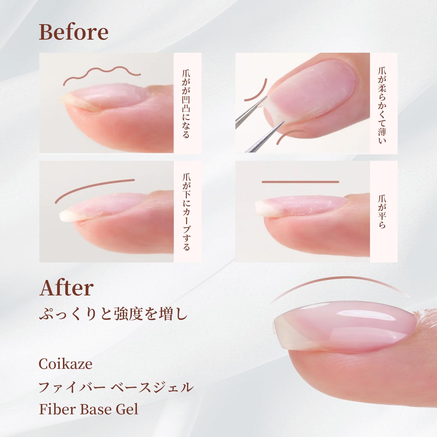 【繊維ベースジェル】特殊な繊維を混ぜ込んだベースジェルです。超強靭繊維を含み、損傷した爪(割れた爪・短爪)の補修に対応。高粘度ながらも良好なセルフレベリングを実現します。使用前にボトルを振るだけで効果が最大化!(商品特徴注意:ジェルは種類により性質が異なる。ジェルはライト照射後、少し柔らかくなる場合があり、ノンワイプトップジェル塗布・硬化が必要。同トップジェル硬化後はベトベト感なし。高ワットライトで 30-60 秒硬化を推奨。あらかじめご了承ください。)
