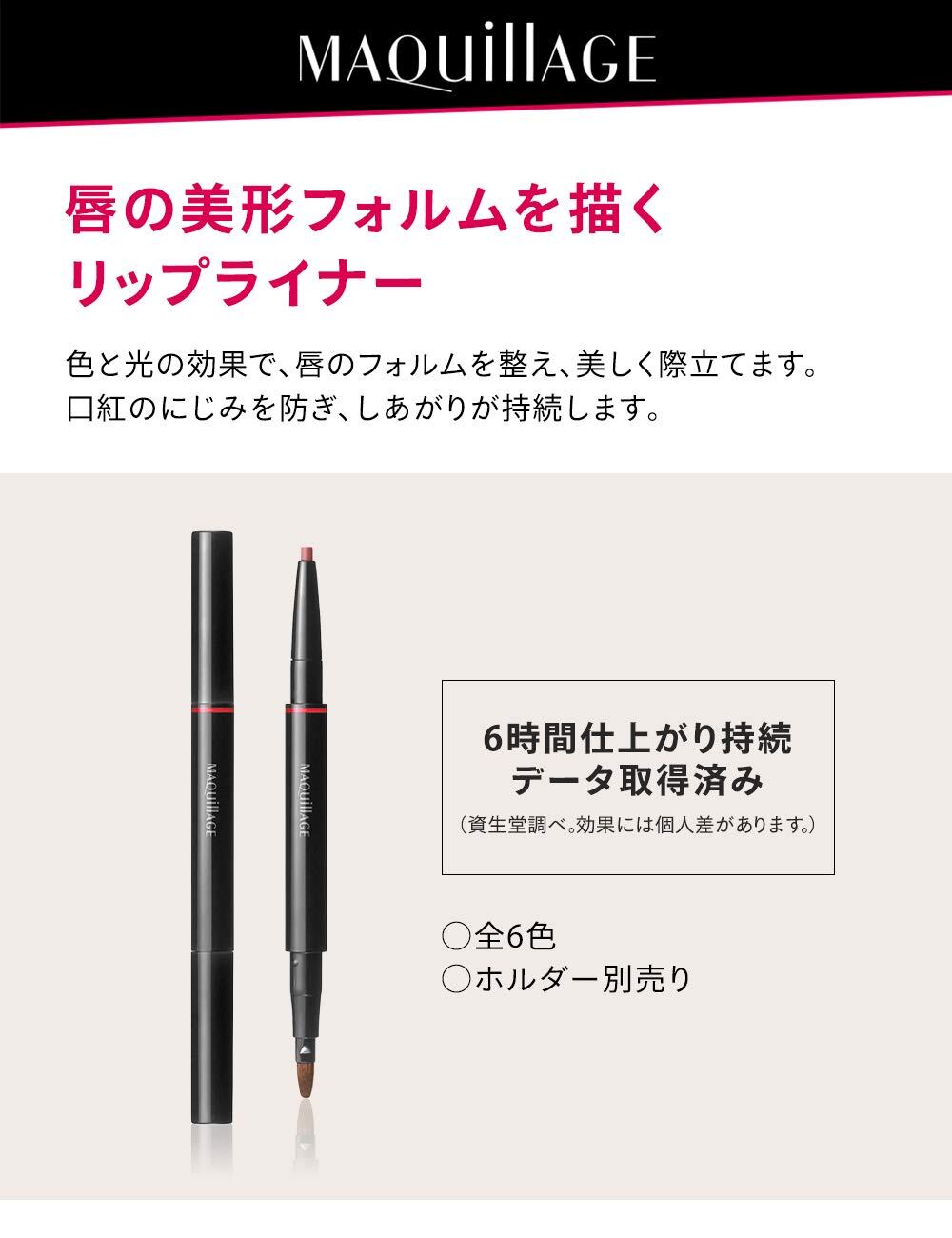 美形フォルムを際立てるリップライナー(カートリッジ)。 色と光の効果で、唇のフォルムを整え、美しく際立てるリップライナーです。 口紅のにじみを防ぎ、仕上がりが持続*します。 *6時間仕上がり持続データ取得済み(メーカー調べ。効果には個人差があります。) ふっくらライトカラー・すっきりクリアカラー・ふっくらソフトシェード 仕上がりで選べる、3タイプのカラー展開。 ○自然な立体感を演出したい方に ふっくらソフトシェード BE303 肌になじみながら唇に自然な陰影をつけてふっくら立体的に見せるカラー ○シアータイプの口紅やリップグロスをお使いの方に ふっくらライトカラー PK210、RD321 明るい発色と輝く光の反射効果で唇のフォルムをふっくらと見せるカラー ○発色の良い口紅をお使いの方に すっきりクリアカラー RS362、RD563、BE774 くっきりとした発色とシェードの効果で唇のラインをすっきりと見せるカラー ※ホルダー別売り。「マキアージュ リップライナー用ホルダー N」(別売)にセットしてお使いください。