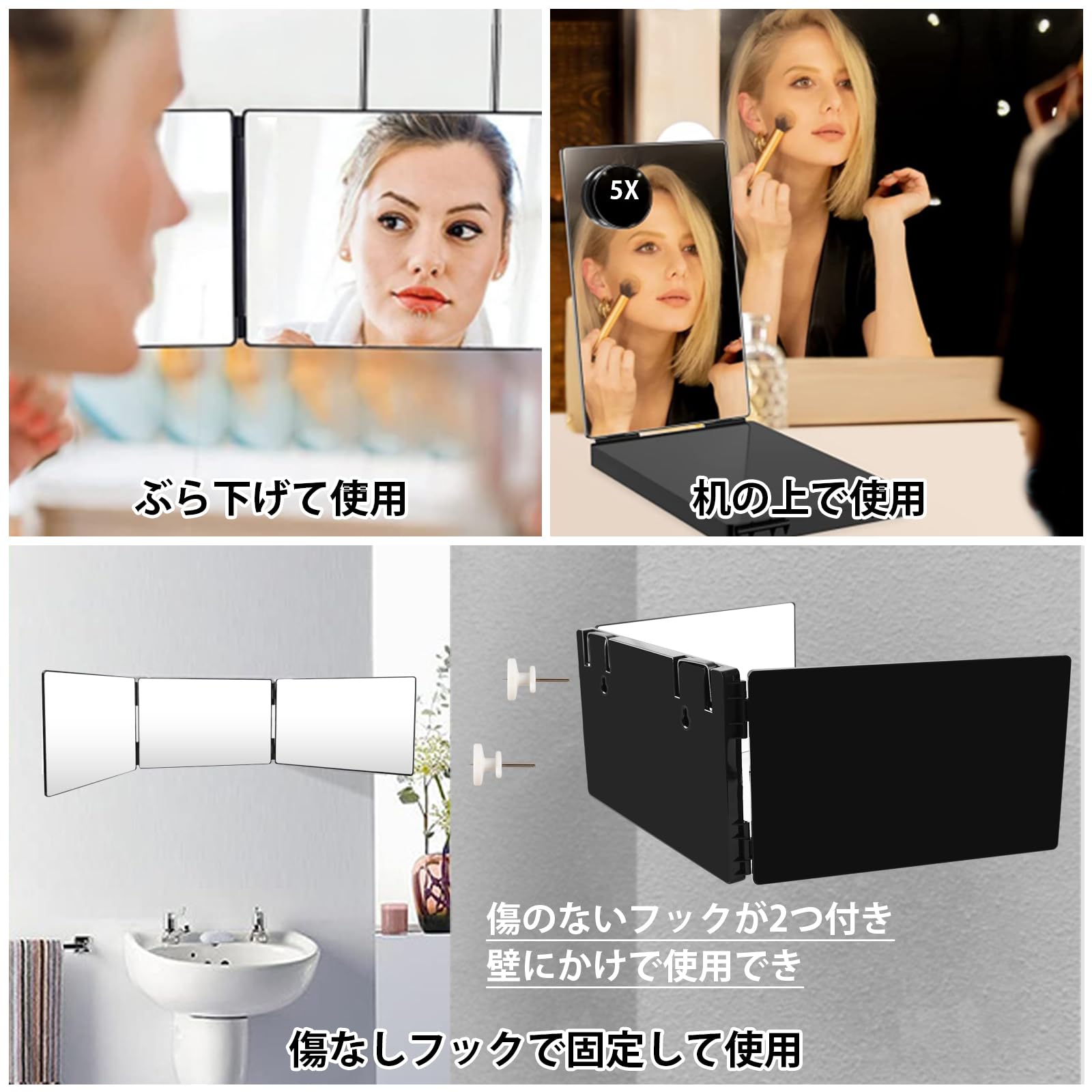三面鏡 セルフカット 360°角度自在調整 化粧鏡 高さ調節可能 鏡 壁掛け 折りたたみ可能 mirror 5倍拡大鏡付き 3ウェイミラー 後頭部が見える 壁掛けミラー HD鏡面 かがみ 大きい 安定して使い 飛散防止 (ブラック)
