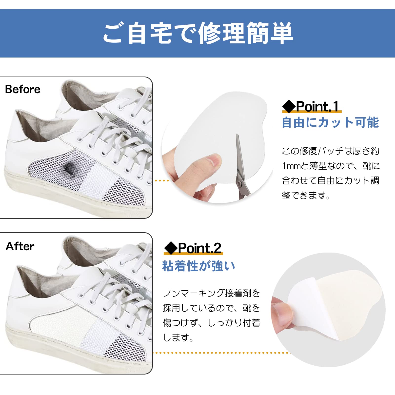 【粘着性が強い&自由にカット可能】 裏面のステッカーをはがして穴に直接貼り付けるだけです。この修理パッチは防水性があり、粘着性が強く、かかと部分に貼ると、滑り落ちる心配がありません。損傷した場所に貼り付けて平らに押します。すり切れた部分をしっかりガードします。また、ノンマーキング接着剤を採用しているので、靴を傷つけません。 &この修復パッチは厚さ約1mmと薄型なので、さまざまなサイズや形にカットしたりすることができ、靴に合わせて自由にカット調整できます。貼る前に一度かかとに当ててサイズを見て、大きい場合はハサミで適切にカットしてください。