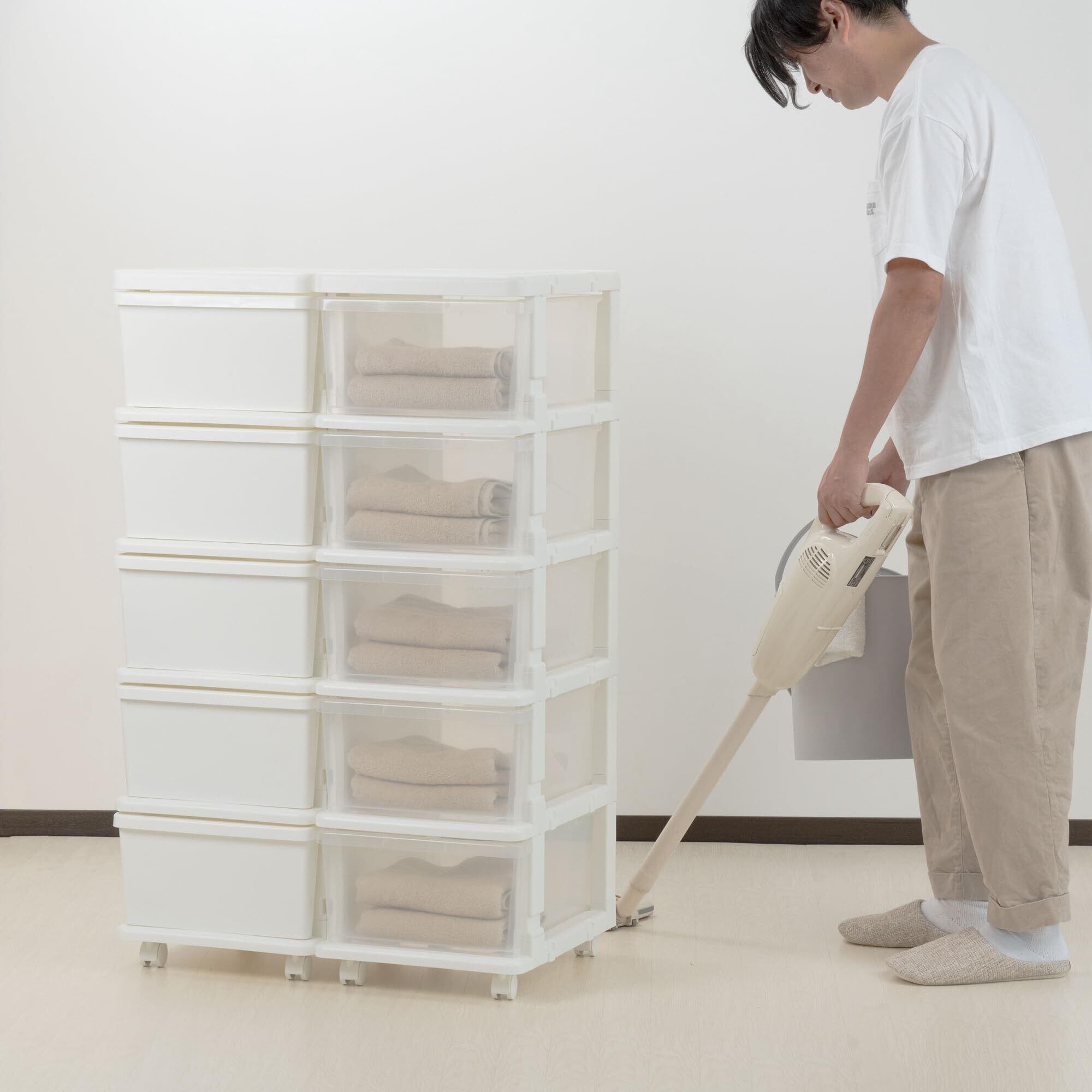 組み立て簡単、中身が見えないカラータイプのスリムチェスト。高さ68.3cmとデスク下にも収納しやすい低め設定。押し入れ収納としても便利に使える。キャスター付きなので、お掃除する時には楽々移動できる。