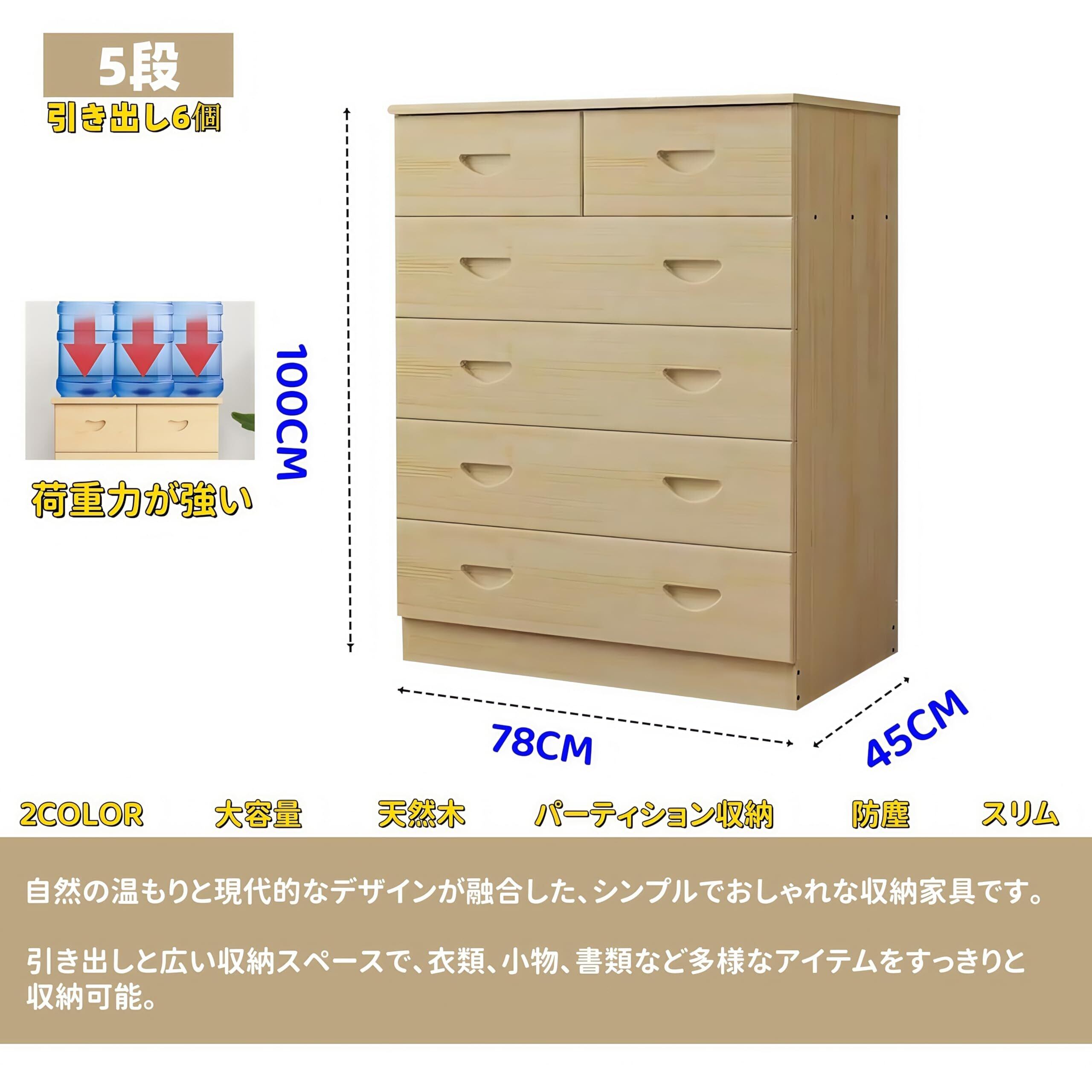 チェスト 収納 スタッキングチェスト 100%天然木 ラクラク引出し 木天板 クローゼット 衣類収納 引き出しフィット タンス スライドレールでスムーズ開閉 シンプル おしゃれ ナチュラル 5段 100X43X78CM