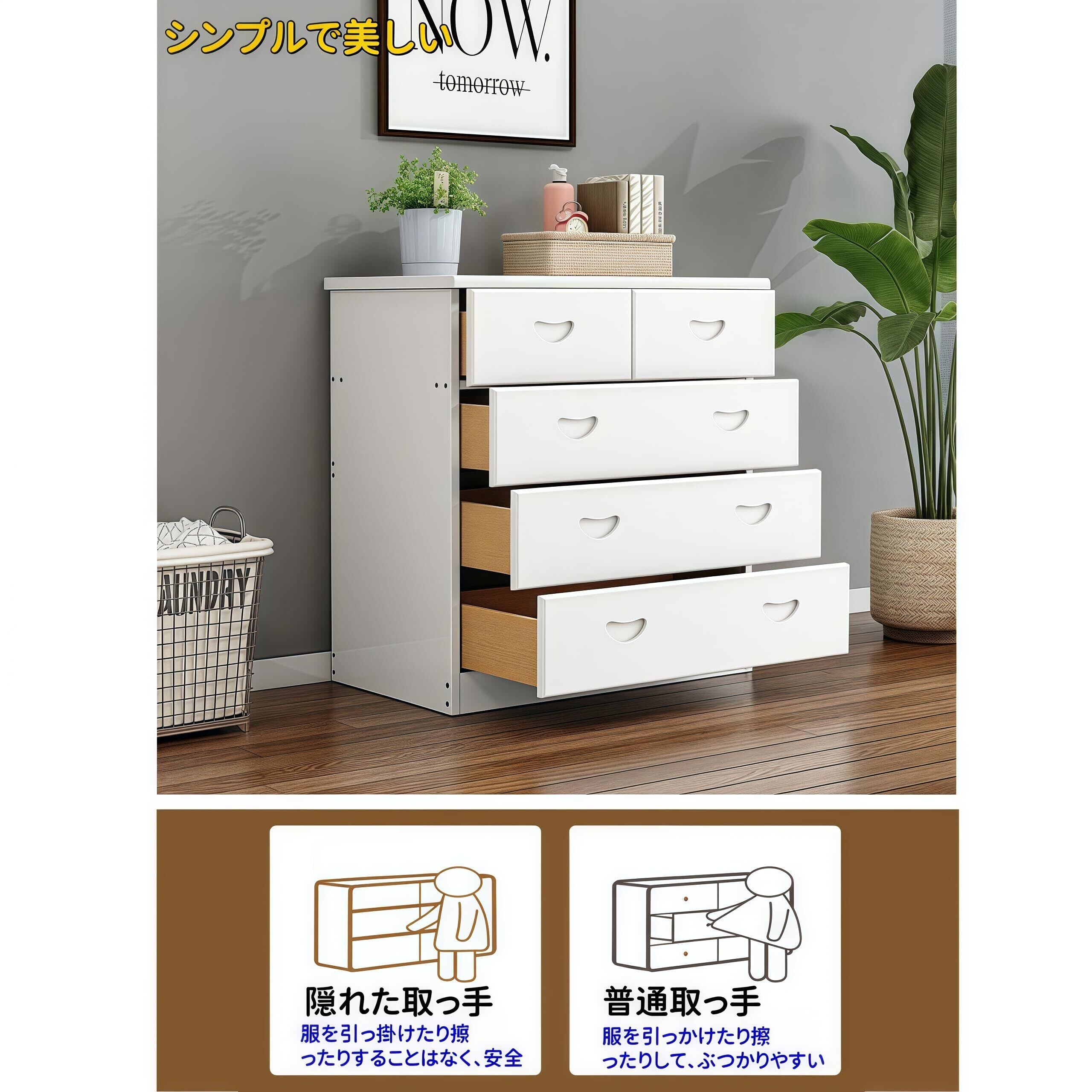 【多様な収納スペースを実現】引き出しと広い収納スペースを備え、衣類、小物、書類、アクセサリーなどさまざまなアイテムをスマートに収納できます。各引き出しのサイズや深さも計算され、収納の効率性を高めています。