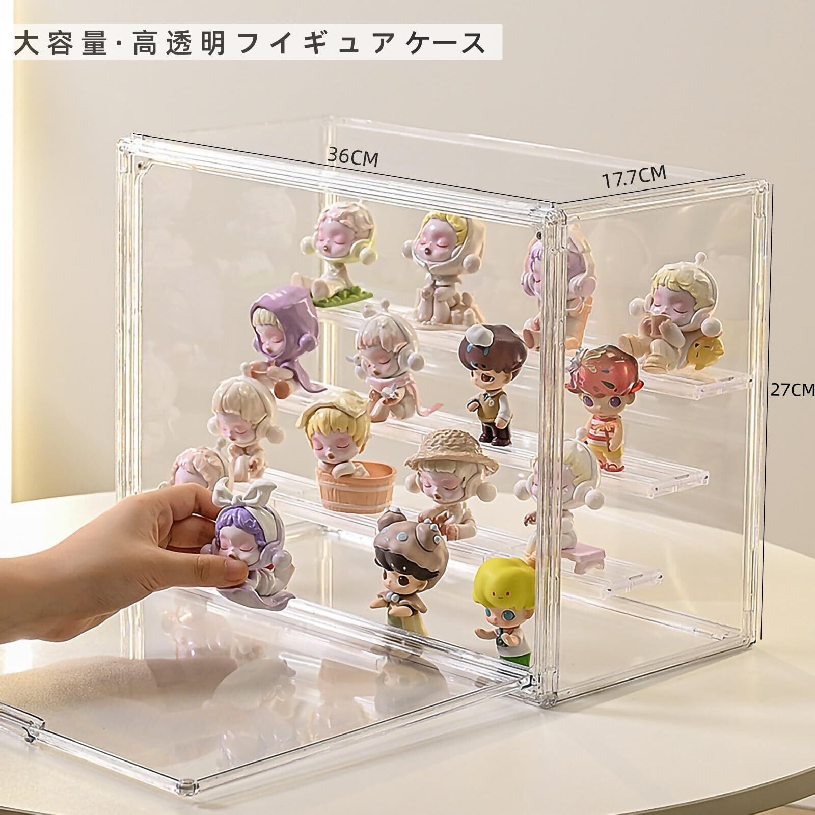 【フィギュアケース商品詳細】サイズ:幅36×奥行17.7×高さ27cm。仕切り付き、最大4段まで使える。仕切りを外せば高さ35cmまでのフィギュアを収納できます。