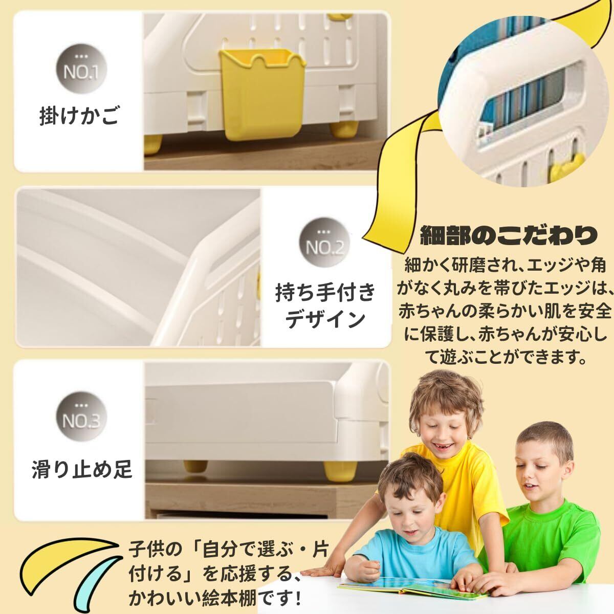 【たくさん入る豊富な収納力】 サイズ:38×30.5×22.3cmコンパクトな見た目ながら収納力は抜群!3段構造で数十冊の絵本を収納可能。省スペースで便利です。便利な付属品付き:側面に取り付け可能な掛けかご&フック付き!クレヨンや小物の収納にもぴったりです。