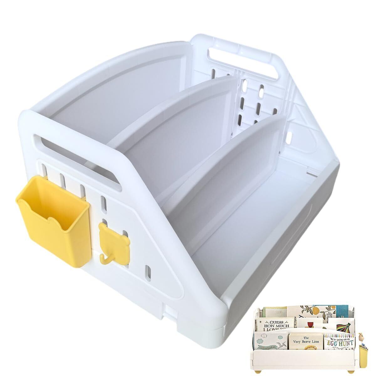 Little Beanキッズ 絵本ラック 子供本棚 大容量 3段 収納ラック おもちゃ整理棚 デスク収納 ベビー絵本整理 持ち手付き 軽量 移動可能 38×30.5×22.3cm 掛けかご&フック付き 安全素材 PP製 (ホワイト)