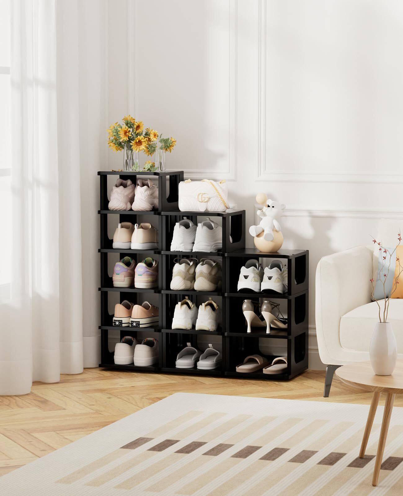 アップグレードされたシューズラック - このシューズラックは、仕切りを取り外してラックの高さを変更し、2段を1つに組み合わせることができるため、ほとんどの種類の靴に適しており、ハイトップ、ブーツ、その他の背の高いアイテムの保管に最適です。 単層の高さは14.3cm、2層を合わせた高さは27.8cmです。 靴の落下を防ぐために各層の端はわずかに盛り上がっており、靴ラックが傾いても靴が落ちません。