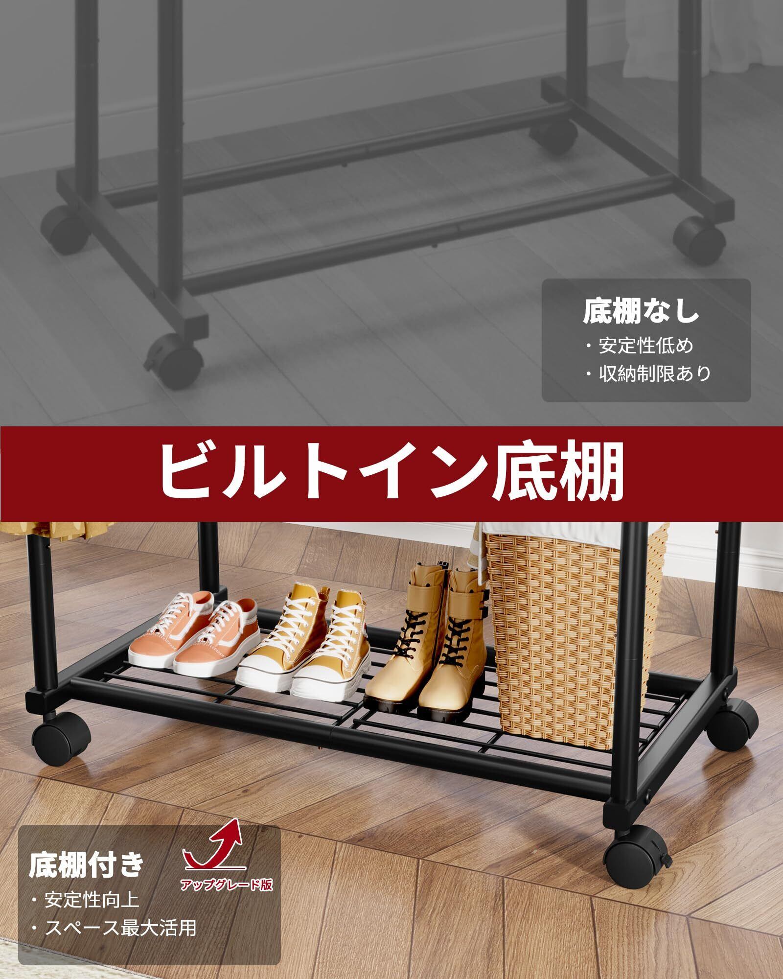 メッシュ棚デザイン:底部には頑丈なメッシュデザインを採用し、収納物を安定して支えます。パイプ棚とは異なり、小物が落ちにくいため、靴やバッグ、ボックス、折りたたみ衣類の収納に最適です。このポールハンガーは、移動の際も衣類が乱れず、安心してお使いいただけます。