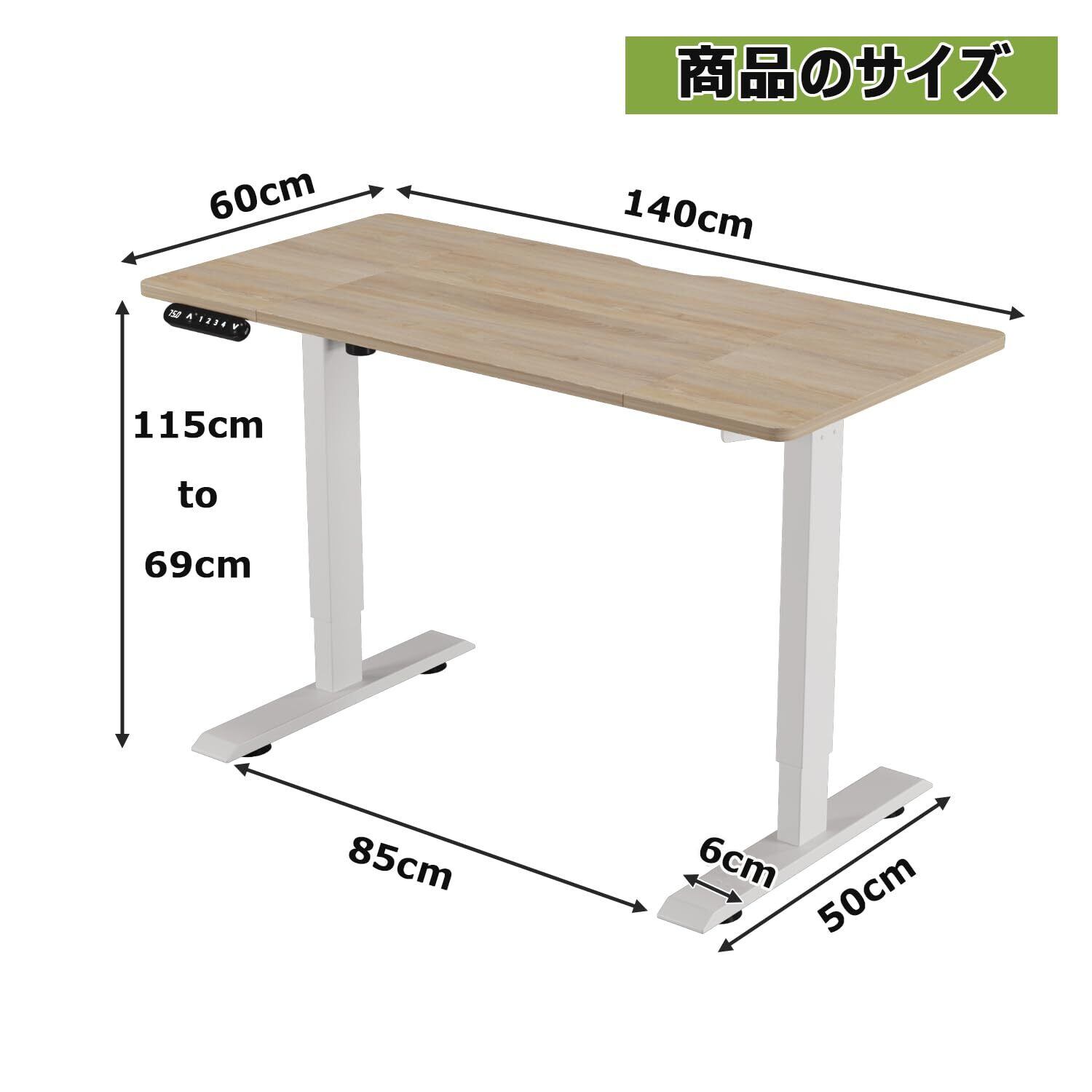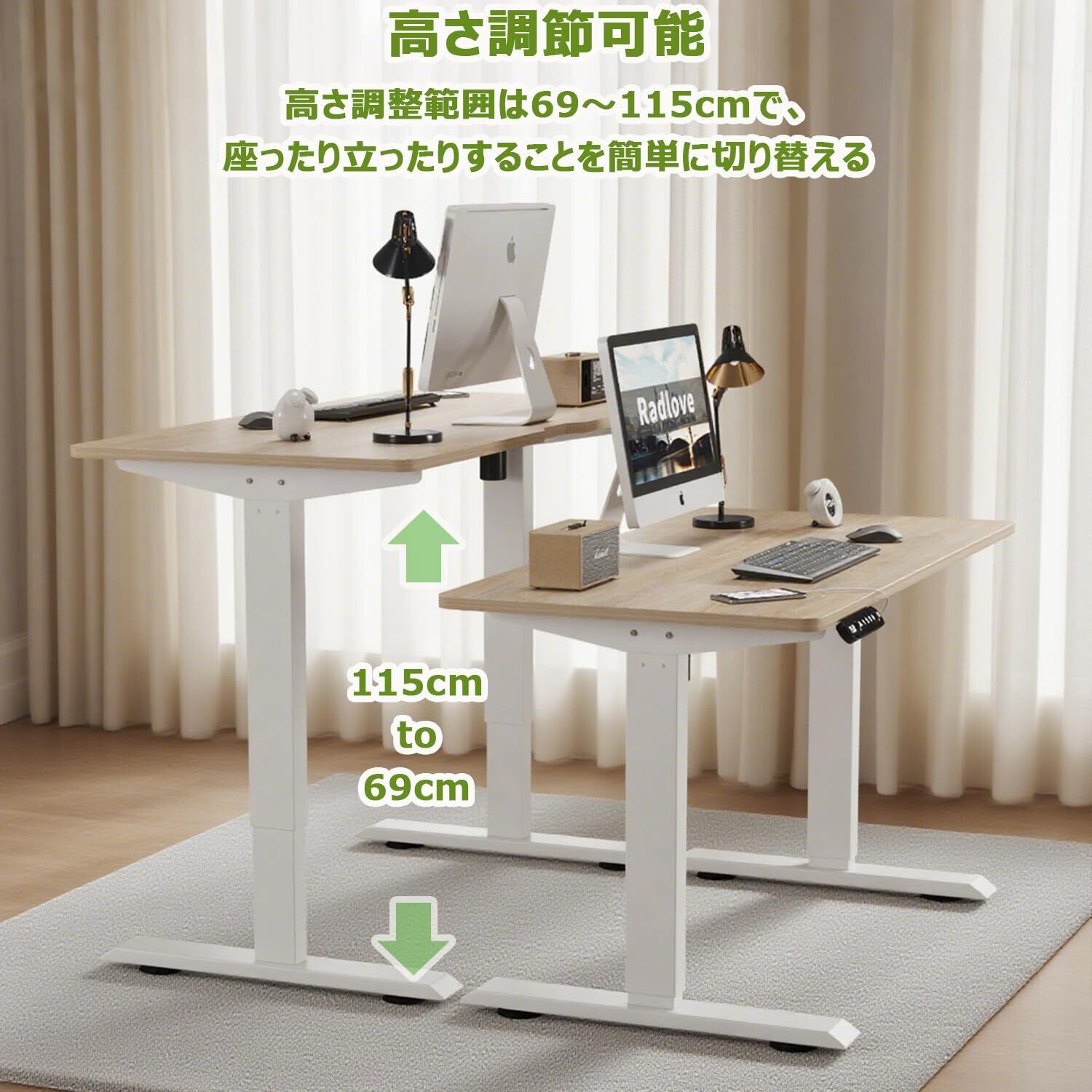 【電気で高さ調節 】この机は、「⮝・⮟」ボタンを押すと、座位から立位まで69cmから115cmの範囲で自由に設定できます。人間工学的な設計に適合しており、人によって身長のニーズに応じて、お希望の高さを調節します。