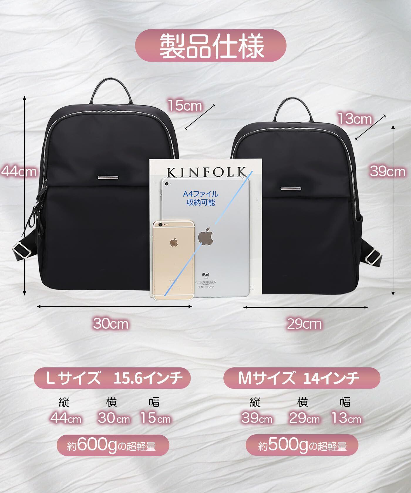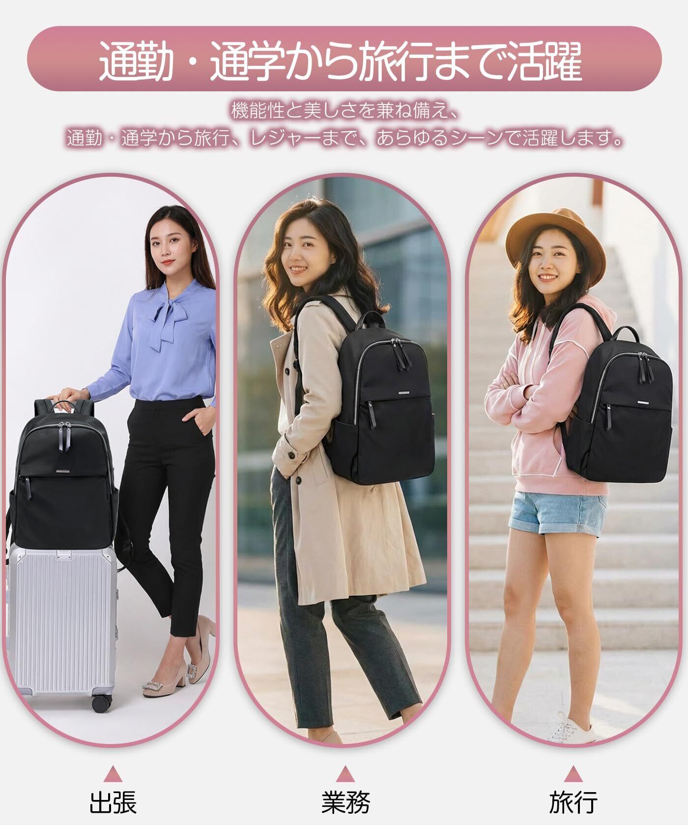 【働く女性を支える、軽量ビジネスリュック】 「重いバッグは肩が凝る」「雨の日の通勤が憂鬱」そんな悩みを解決するために生まれた、重さわずか500gの超軽量リュックです。自転車通勤や徒歩移動でも負担にならず、両手が空くのでアクティブに動けます。シンプルで上品なデザインは、スーツからオフィスカジュアルまで、毎日の通勤コーデを格上げします。
