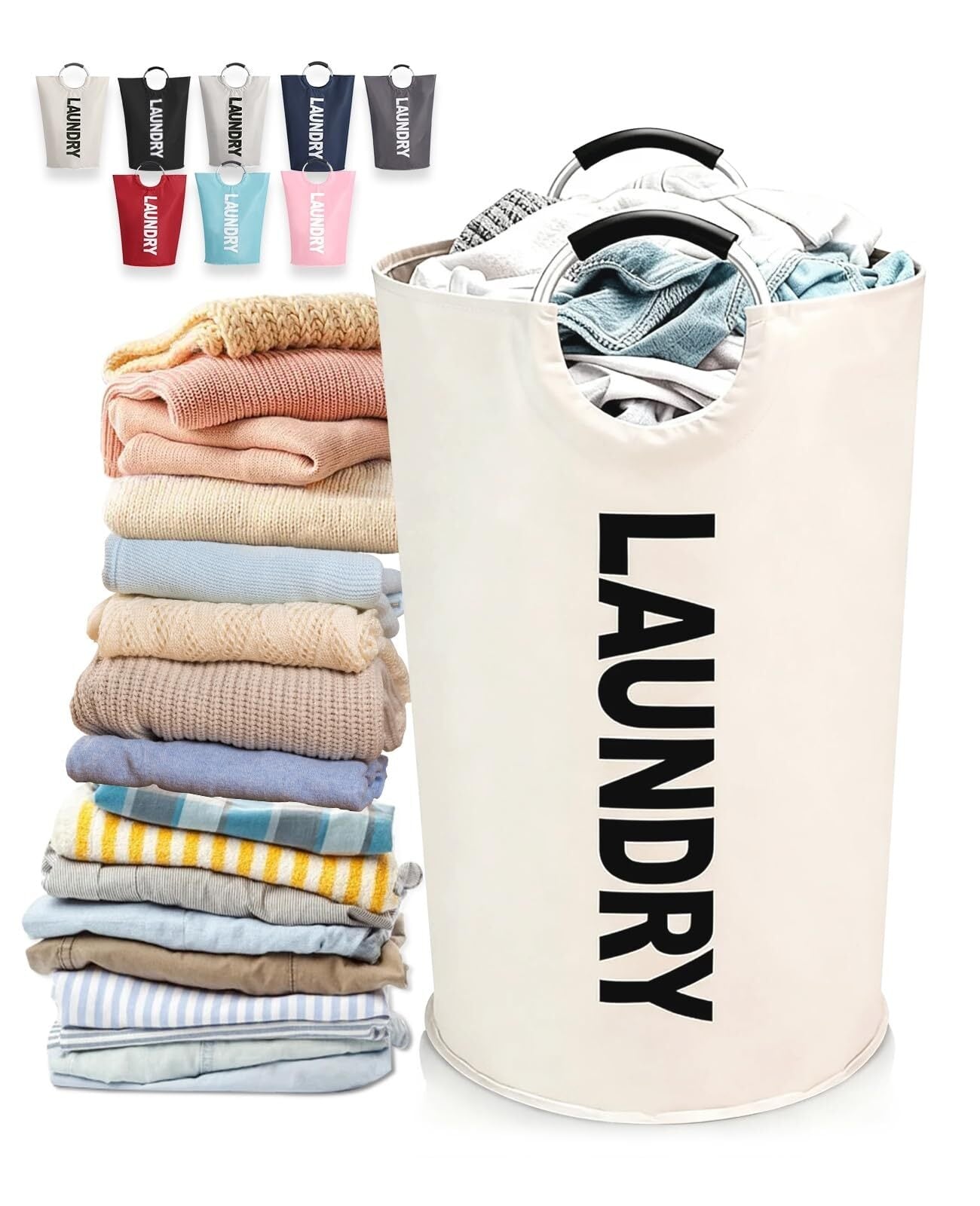 ランドリーバスケット 大容量115L 洗濯かご 折りたたみ 撥水加工 自立式 耐荷重15KG 取っ手付き 家族用 まとめ洗い・コインランドリー対応 (オフホワイト)