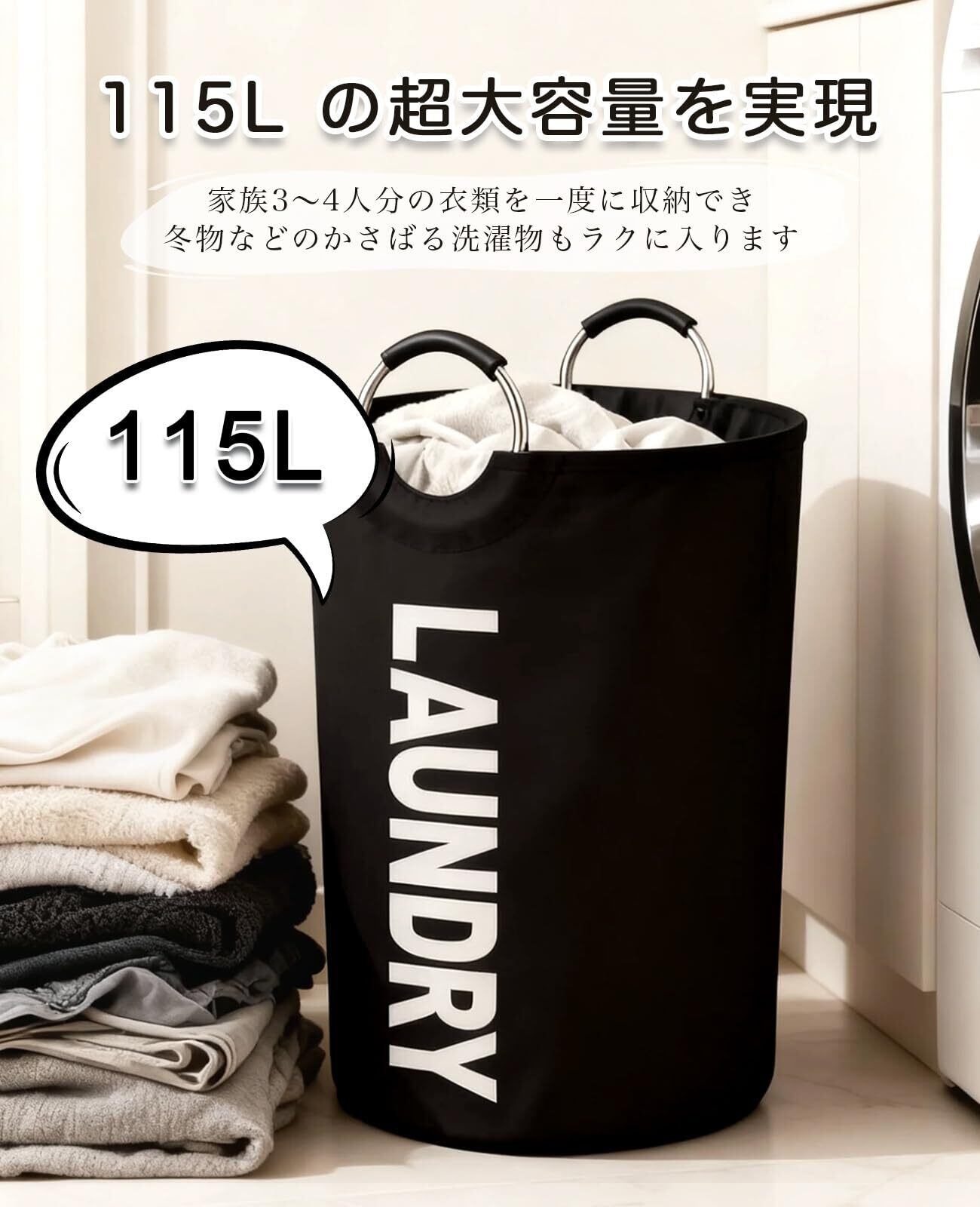 【家族分も冬物も一気に入る・115L超大容量】毎日の洗濯で洗濯物があふれてしまう悩みを解消。115Lの超大容量で、家族3〜4人分の衣類・タオルはもちろん、冬物コートや毛布・布団までまとめて収納でき、忙しい家庭のまとめ洗いに最適です。