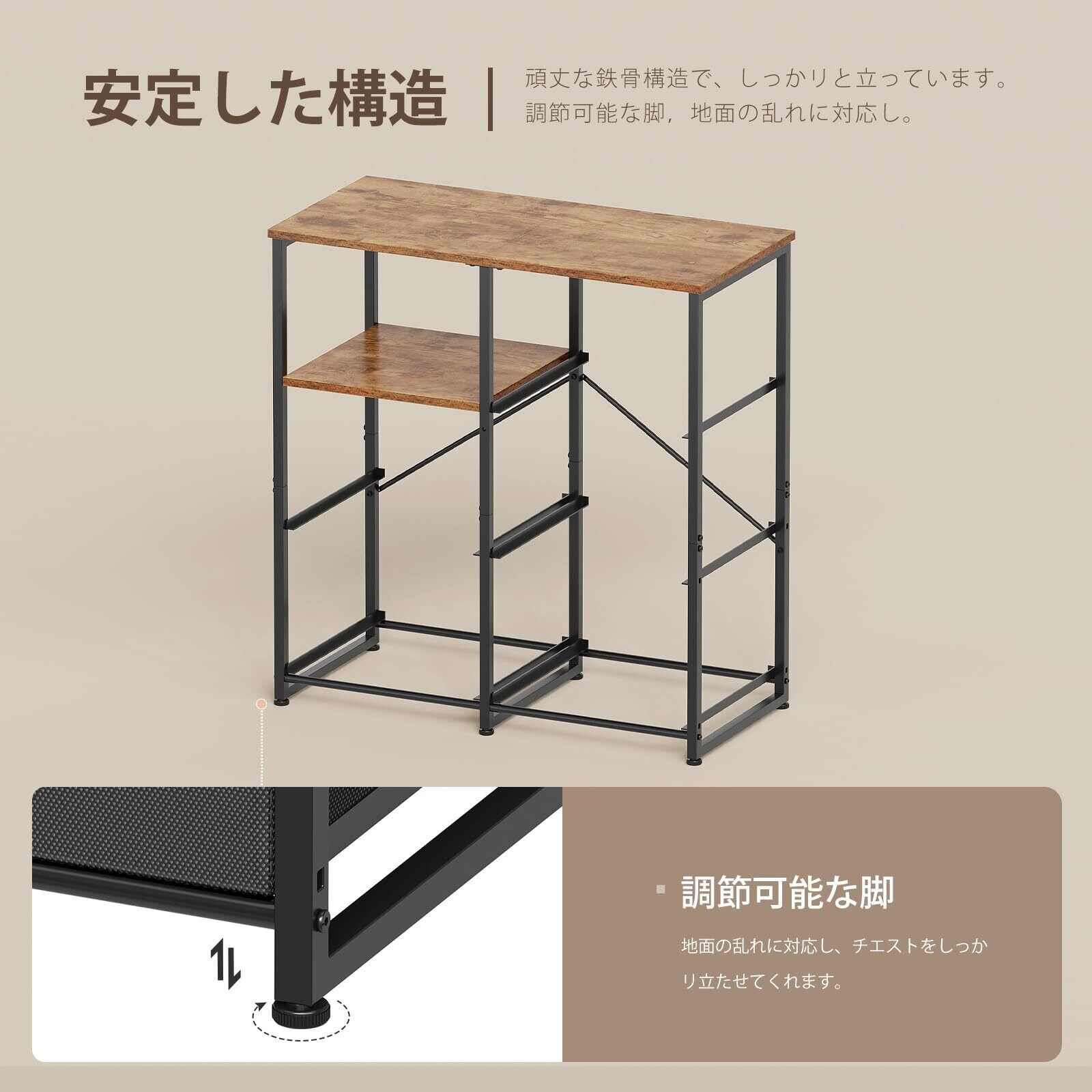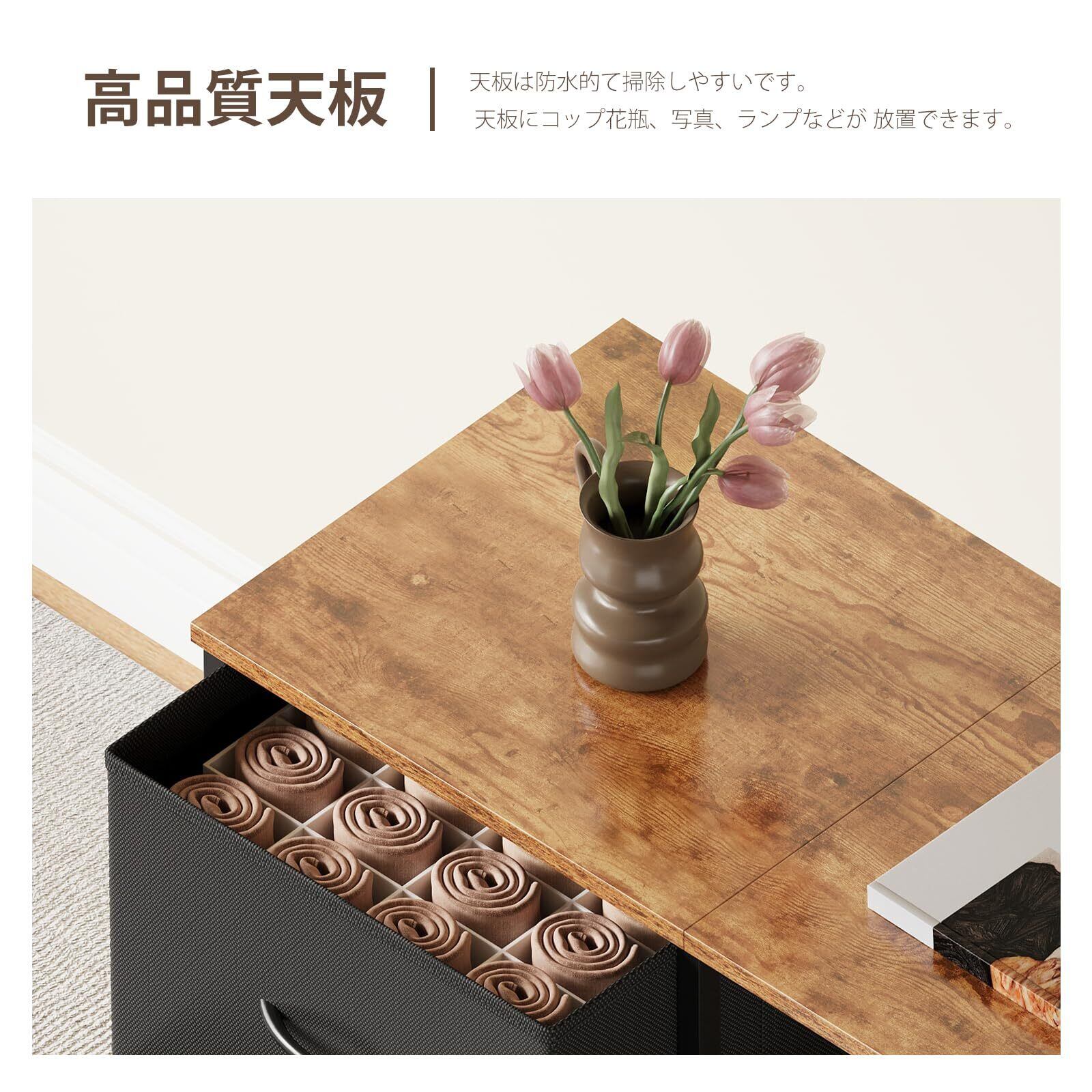 【耐久性と安全性に優れた素材】:天板は30kgまで耐える強度。表面は防水・防傷加工で、日常の使用にも安心です。布引き出しは高強度PPレールを採用。6kgまで耐え、長期間スムーズな開閉を実現します。すべての素材は安全基準をクリア。