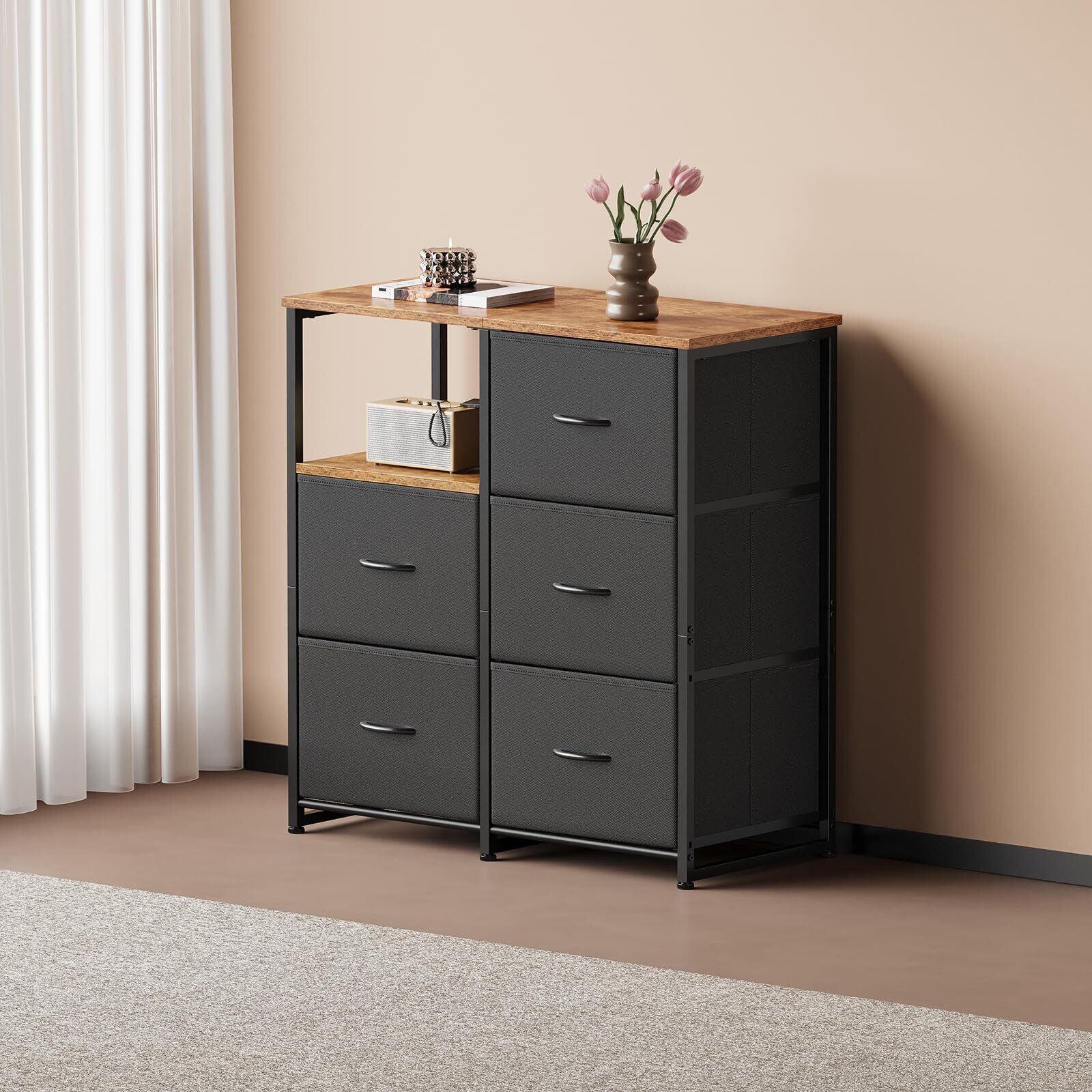 【大容量の収納スペース】:5つの大きな引き出しで、様々なアイテムを整理して収納できます。シンプルなデザインですが、5つの引き出しは抜群の収納力を発揮します。アクセサリー、書類、おもちゃ、おやつから、タオルや冬物衣類などの大きなアイテムまで、あらゆるものを楽々と収納できます。上部と左上のコーナー棚には、鍵、本、カップ、花瓶、写真なども収納できます。
