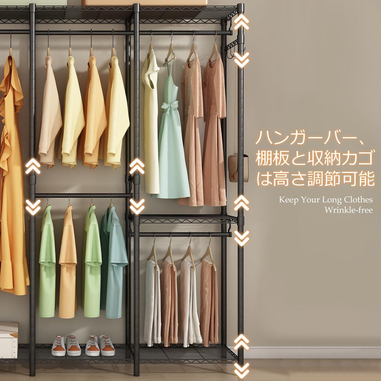 【多機能デザイン】:狭いお部屋でもスペースを有効に活用できる大容量設計。丈夫な洋服ラックには6つの棚、4つのハンガー、2つの引き出しバスケットが付き、さまざまな収納スペースを提供してくれます。金属製の棚とハンガーは上下に調整したり、必要に応じて取り外したりして、異なるサイズのアイテムを収納できます。靴の収納、ハンギング収納、折りたたみ収納、ドレスの収納を提供して、スペースを最大限に活用。