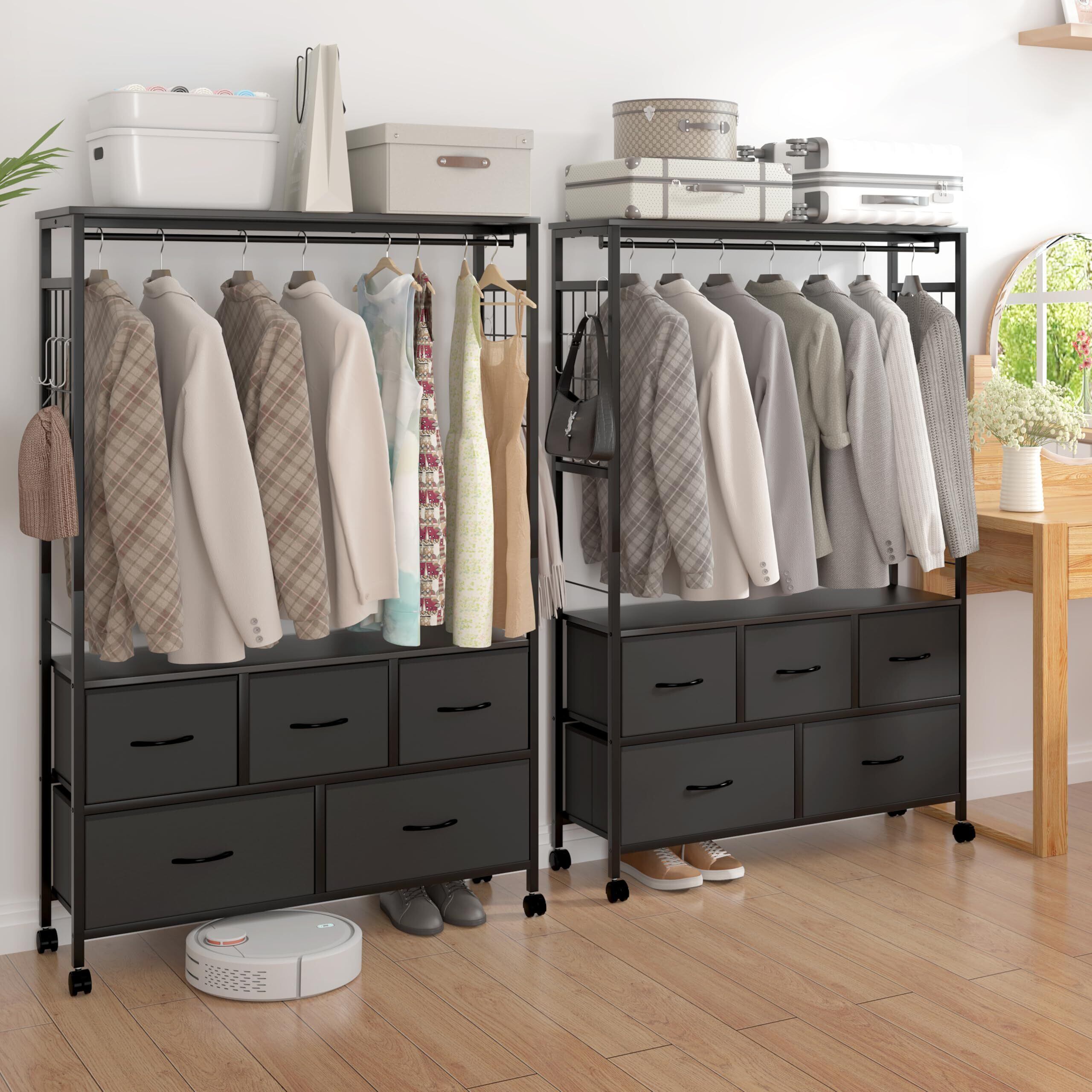 LunarLight ハンガーラック 幅100奥行30高さ151.2cm パイプハンガー ワードローブ クローゼット引き出し 洋服掛け 衣類コンパクトで収納 多機能 収納チェスト 収納ケース 大容量 頑丈 スリム おしゃれ ストッパーキャスター付き(移動式と固定式2種類) 全体耐荷重150kg 組立簡単 耐震転倒防止 大容量引き出し2段5個 (ブラック)