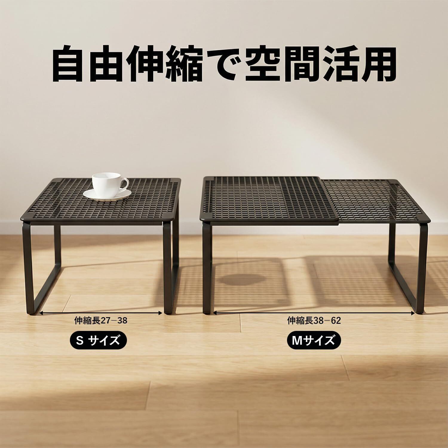 【27cmから38cmまでの無段階調整機能】収納棚スタンドラ最大の特徴は、27センチメートルから38センチメートルの間で自由に幅を調節できる点です。ネジや工具を必要としないシンプルなスライド式機構を採用しており、お使いの収納スペースの実際の寸法に合わせて、最適なサイズに簡単に合わせることができます。押し入れの奥行きや、キャビネット内の隙間など、従来は活用しづらかった不規則なスペースにもぴったりと収まり、収納効率を飛躍的に向上させます。