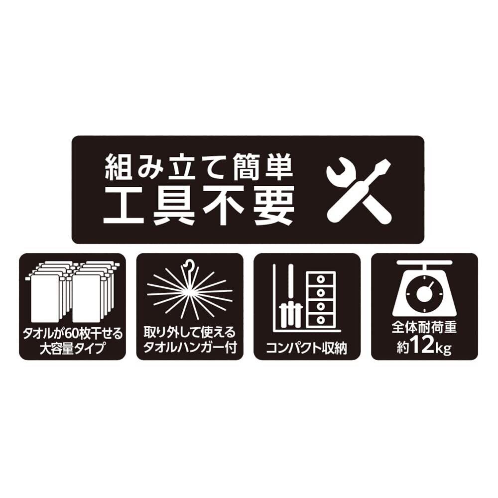 タオル掛け部は上段20本・中段20本・下段20本とたくさん干せる大容量仕様。