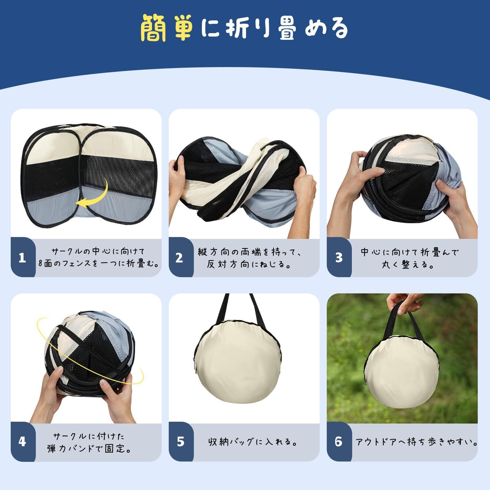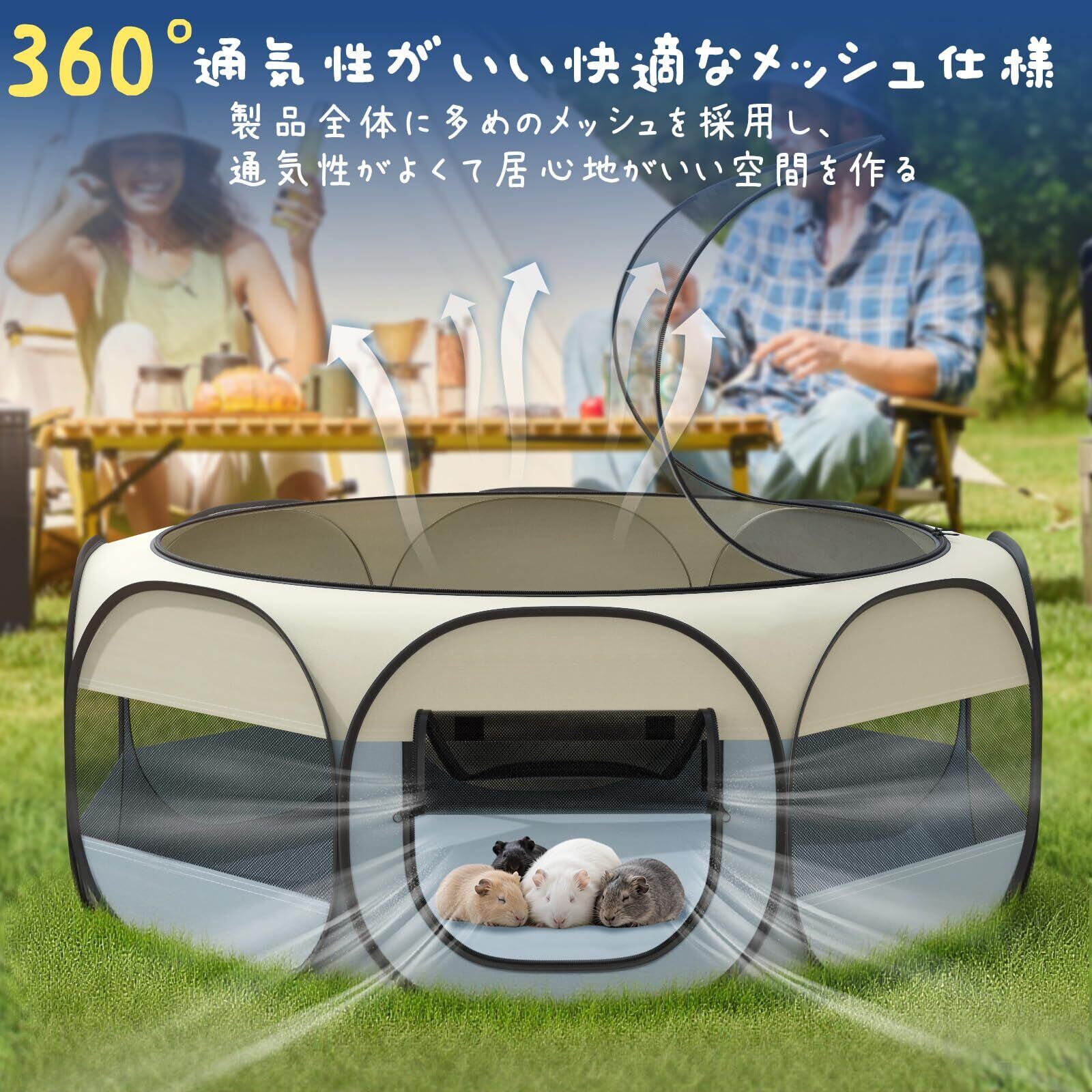 「遊び用小動物サークル」 側面はオックスフォード布+メッシュ素材を採用しており、耐久通気性に優れています。取り外せるファスナー式のメッシュ屋根付き、ペットの飛び出すを防止します。正面に巻き上げて固定できるカーテン式扉が設計されており、ペットの出入りが便利です。猫、小型犬、ハリネズミもなどの小型動物に最適です。