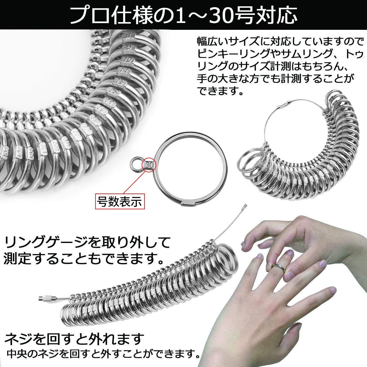 日本規格 に 準拠 した リングゲージ で、 1号 〜 30号 まですべての サイズ を 測定 することができます。 ミニサイズ も測定できます。また、偶数のサイズを揃っておりますので、ぴったりのサイズが図れます。