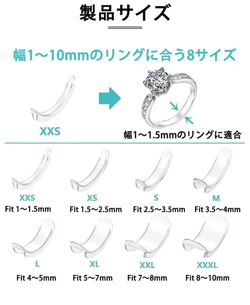 【8サイズ対応】幅1mm~10mmの指輪に最適なリングアジャスター。ピンキーリングから太い指輪まで、サイズ調整が簡単にできます。リング サイズ調整や指輪 ズレ防止に便利なアイテムです。