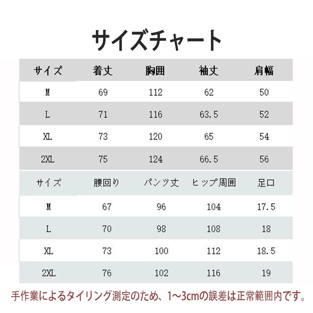 【サイズM】腰回り:67 パンツ丈:96 ヒップ周囲:104 足口:17.5【サイズL】腰回り:70 パンツ丈:98 ヒップ周囲:108 足口:18【サイズXL】腰回り:73 パンツ丈:100 ヒップ周囲:112 足口:18.5【サイズ2XL】腰回り:76 パンツ丈:102 ヒップ周囲:116 足口:19