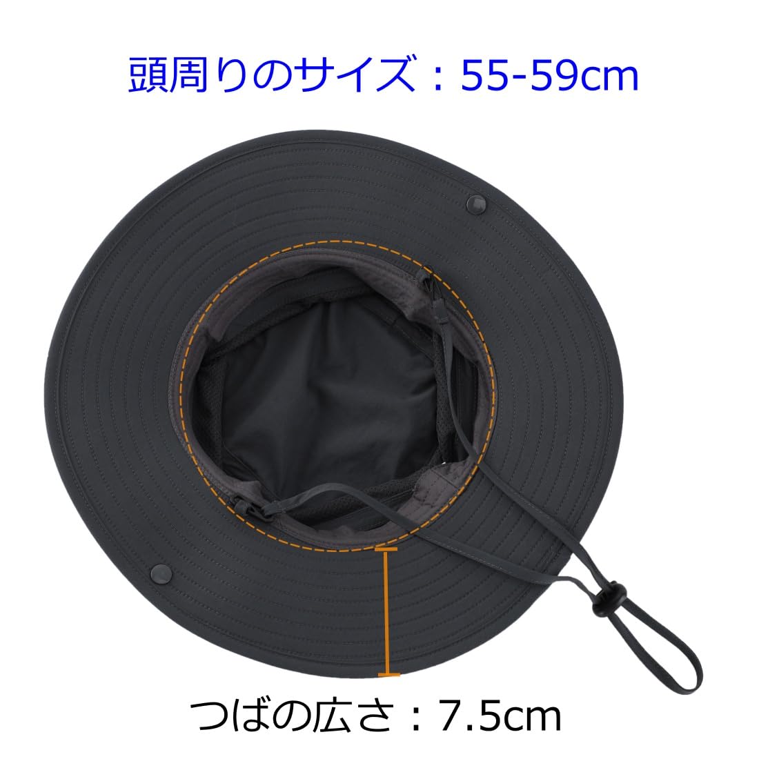 頭周りのサイズ:55-59cm、帽子の後ろに調節ドローコードが付き、頭にピッタリ合わせることができる