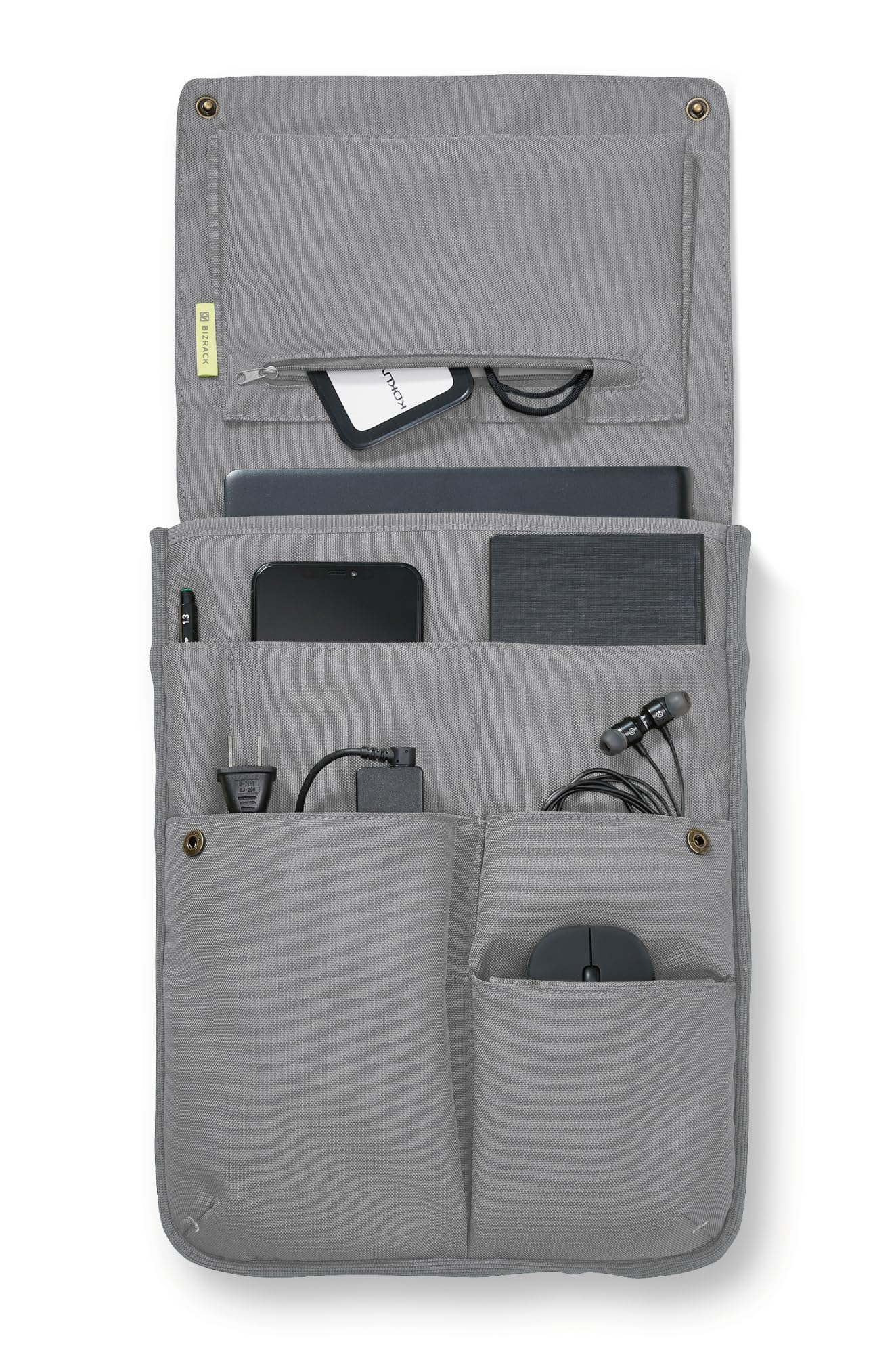 文房具からPC周辺のツールまで一式を収容することができる機能的なポケット。マウスやACアダプタの専用ポケットを設けることで、PCを傷つけにくく収容効率が高まる設計。またファスナー付きポケットにはIDカードや名刺などの大切な物を収容するのに便利。