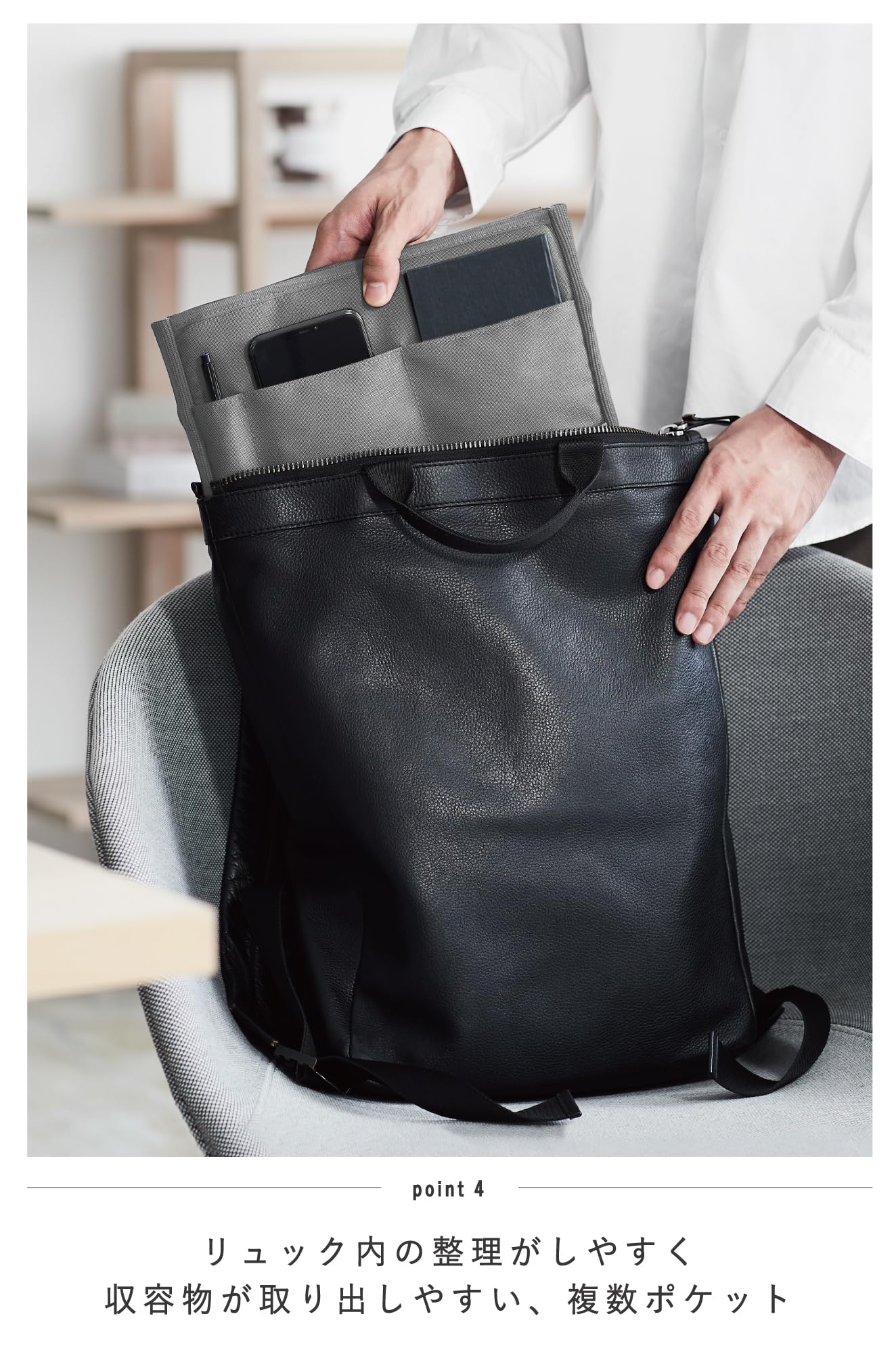 POINT4:バッグ内の整理がしやすく収容物が取り出しやすい、複数ポケット。