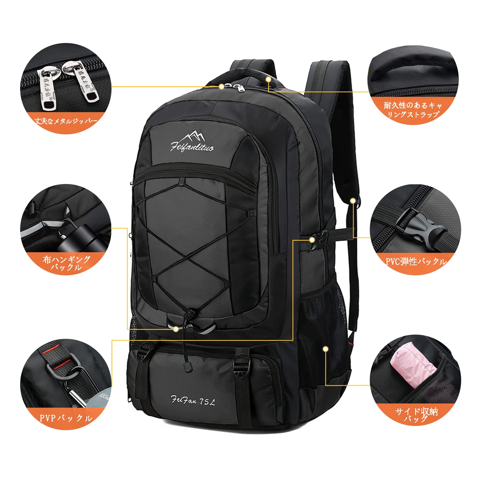 【大容量リュックサック】75Lの超大容量キャンプリュック、1つのメインジッパー式コンパートメント、3つのジッパー式フロントポケット、2つのサイドストラップ、複数のハンギングバックル。 ノートパソコン、カメラ、ハイキング用クラッチ、テント、本、衣類、靴、水ガラス、傘、その他の日用品を収納できます。