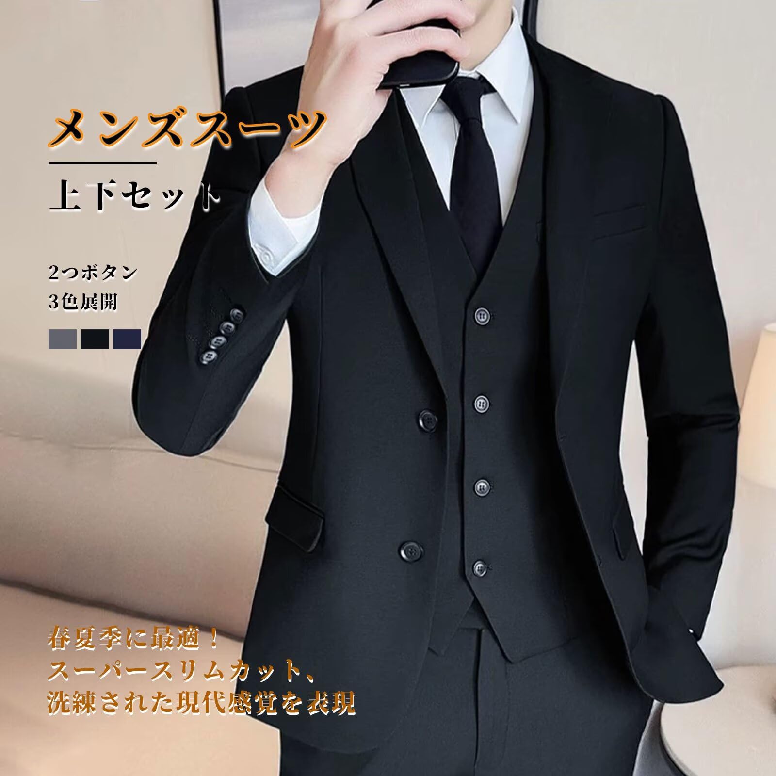 [Yeagio] メンズスーツ 上下セット 裾上げテープ付 ビジネス 2つボタン 2点セット フォーマル スリム セットアップ 就職スーツ 礼服 喪服 結婚式 無地 スーツ メンズ
