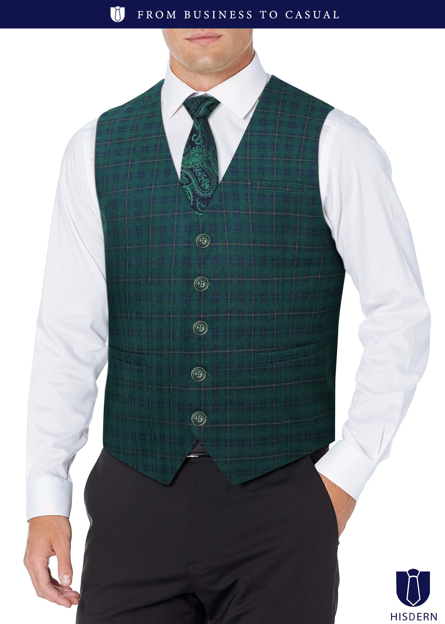 [HISDERN] VC-02 チェック柄 スーツ ベスト メンズ Vネック 5ボダン 3ポケット 17色選択 尾錠付き ビジネス 結婚式 フォーマル ベスト フィット 大きいサイズ