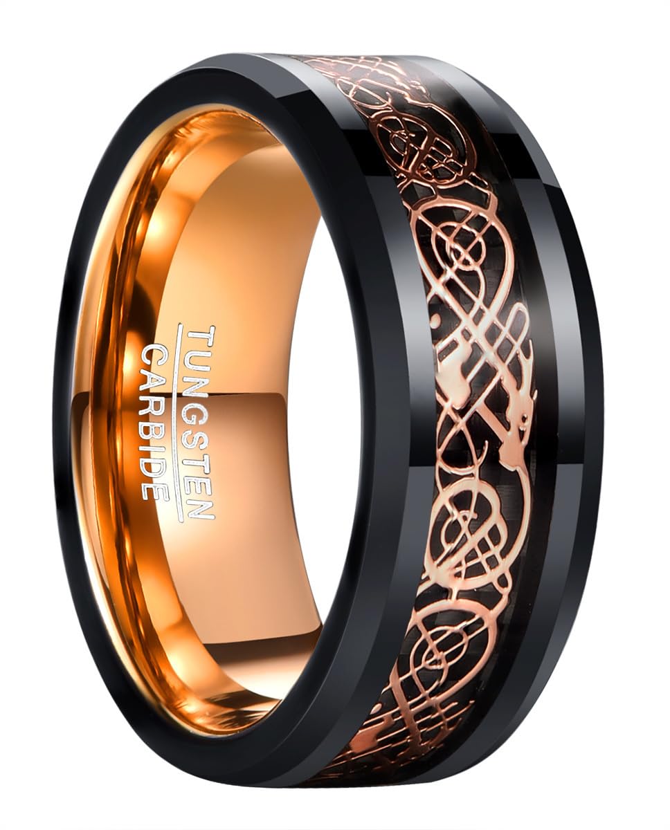 083基地 メンズ 指輪 リング タングステン ドラゴン 竜紋 カーボン 炭素繊維 横幅8mm 平打ち ピンクゴールド 真空メッキ 17号