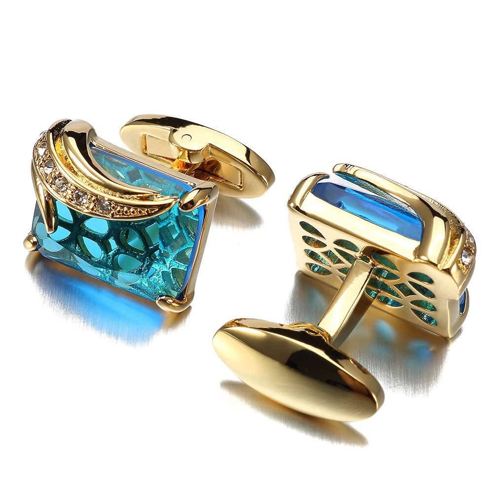 Rockyu カフスボタン メンズ シルバー ブルーガラス 長方形 ステンレス スーツアクセサリー 結婚式 ビジネス プレゼント (ブルージルコン シルバーメッキ真鍮)